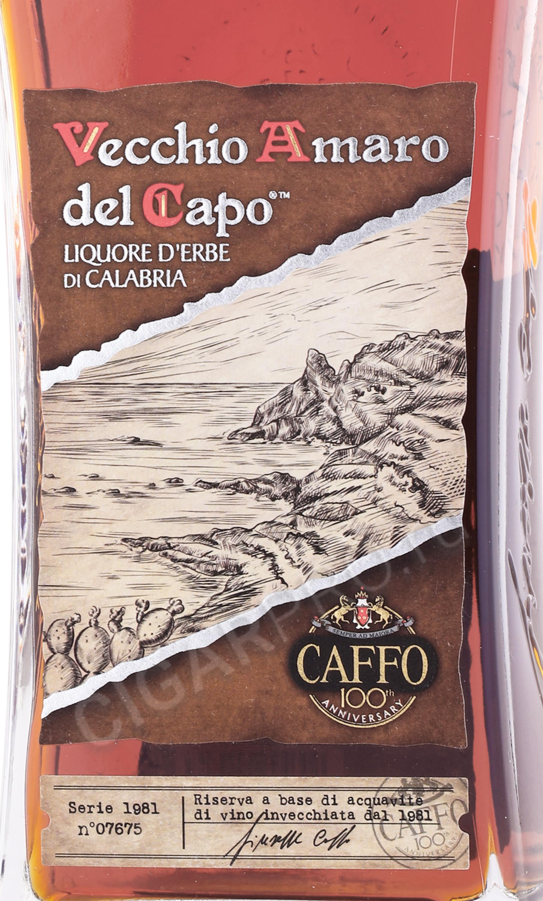 Ликер Caffo Vecchio Amaro del Capo Riserva del Centenario — эксклюзивный десертный спиртной продукт премиальной категории, который был выпущен в 2015 году ограниченным количеством бутылок в честь 100-летнего юбилея компании-изготовителя. В отличие от классического алкоголя, выпускаемого итальянской маркой на постоянной основе, он прошел выдержку в барриках из славонского дуба. Состав у него аналогичный: в нем присутствуют 29 ароматных ингредиентов (корица, цитрусовая цедра, анис, ромашка, можжевельник и др.). Ликер упакован в бутылки 0,7 л из коричневого стекла, каждая из которых имеет индивидуальный номер и находится в стильном картонном боксе.