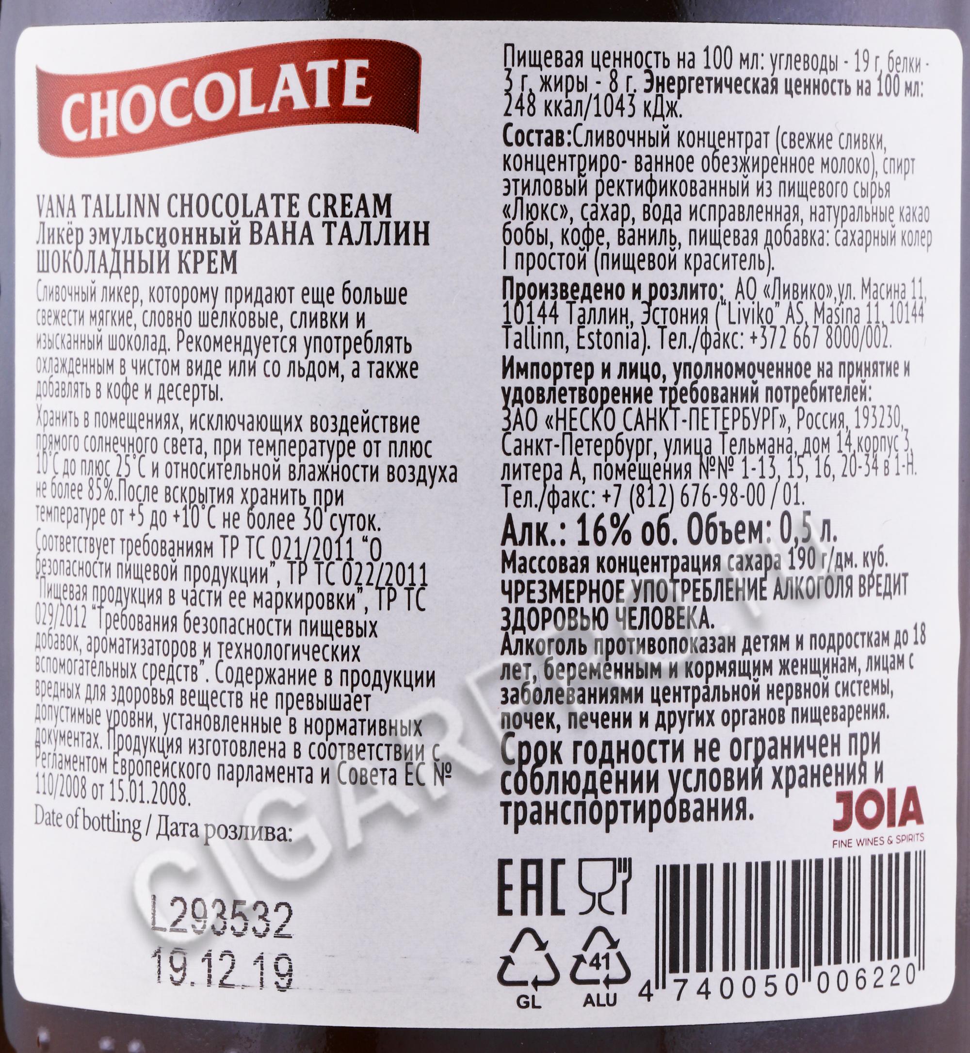 Vana Tallinn Chokolate - это изысканный крем-ликер, который изготавливается по уникальному рецепту на основе традиционного ликера Старый Таллин с добавлением нежных сливок и шоколада. Ликер Старый Таллин Шоколад изготавливается исключительно из натуральных компонентов, таких как корица, ваниль и цитрусовые масла, а также натуральные сливки и шоколада. Ликер Vana Tallinn Chokolate характеризуется многогранным сливочным ароматом с нотками рома и шоколада, вкус напитка – бодрящий с оттенками рома, сливок и сливок. Ликер Vana Tallinn Chokolate рекомендуется потреблять в чистом виде со льдом в качестве дижестива, а также добавлять в коктейли и в кофе.