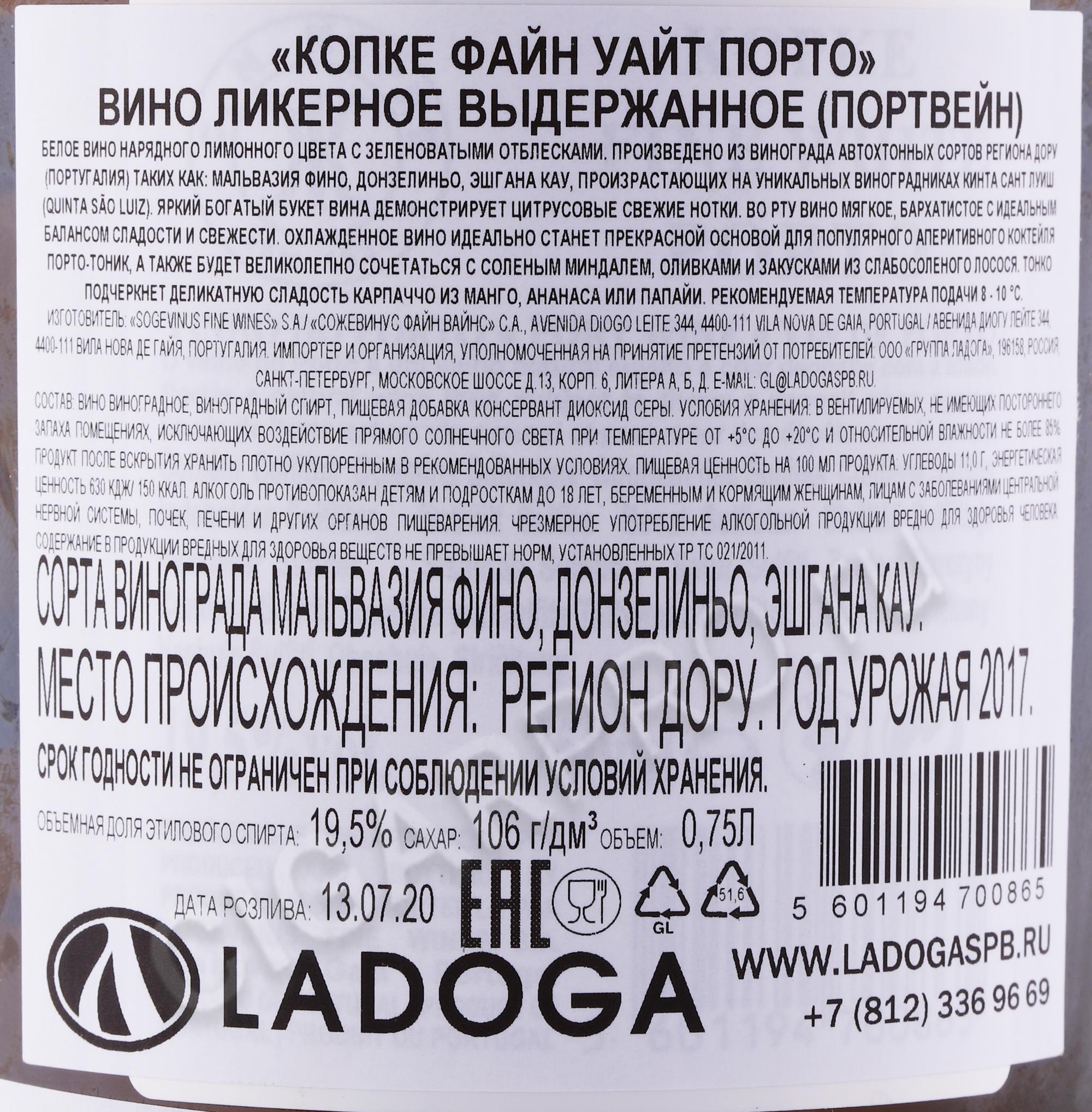 Портвейн Копке Файн Уайт имеет объём бутылки: 0,75 с содержанием сахара: 106 г/л
