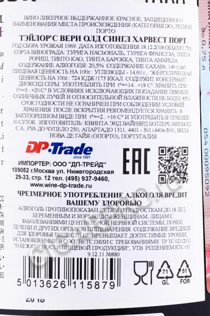 Портвейн Taylors Very Old Single Harvest Port 1969 имеет объём бутылки: 0,75 с содержанием сахара: 150 г/л