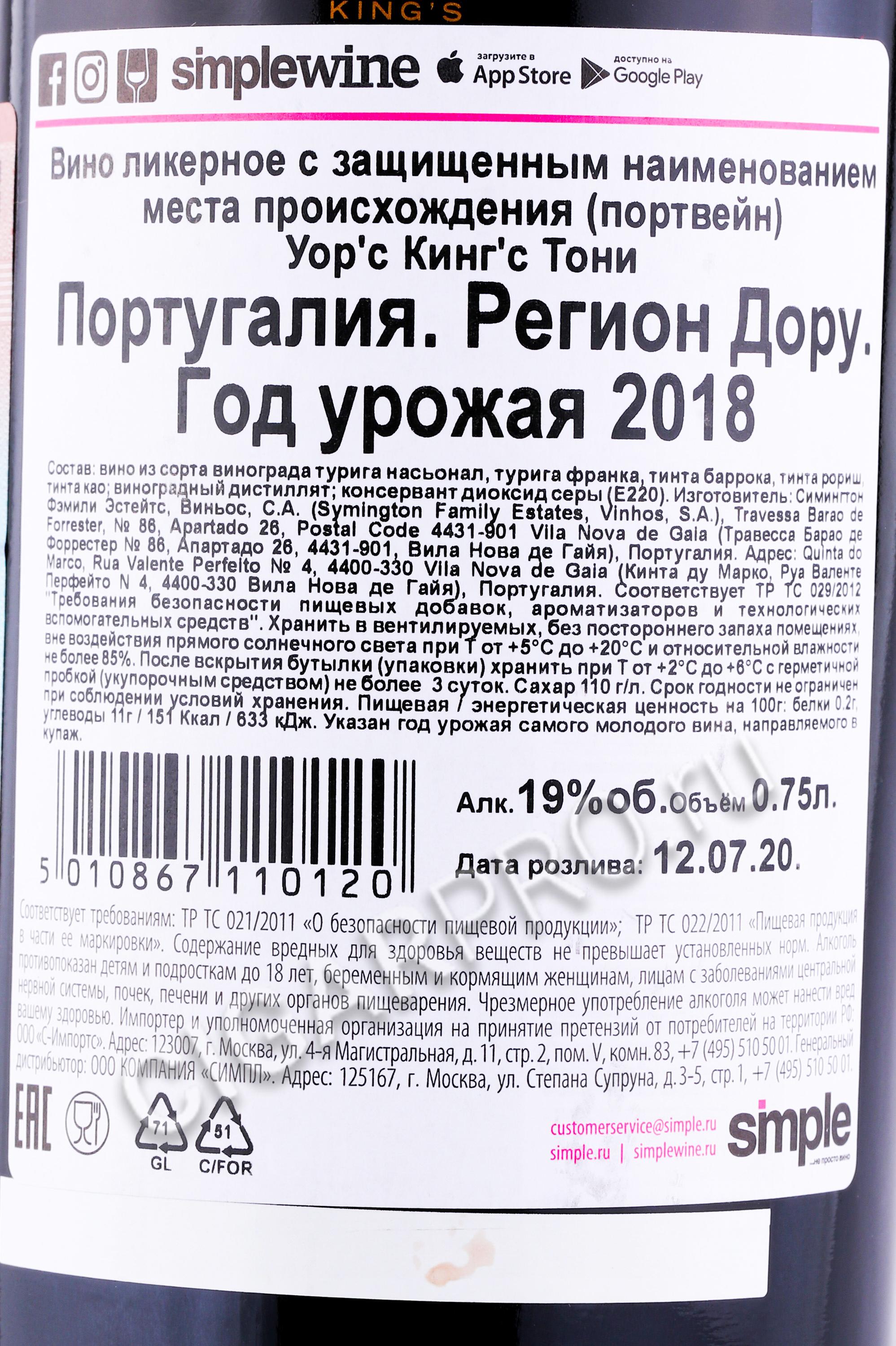 Портвейн Warres Kings Tawny имеет объём бутылки: 0,75 с содержанием сахара: 101 г/л