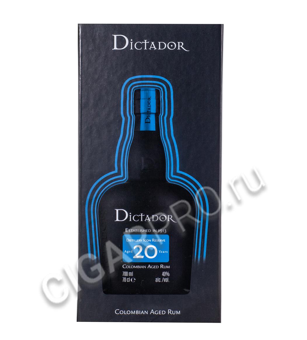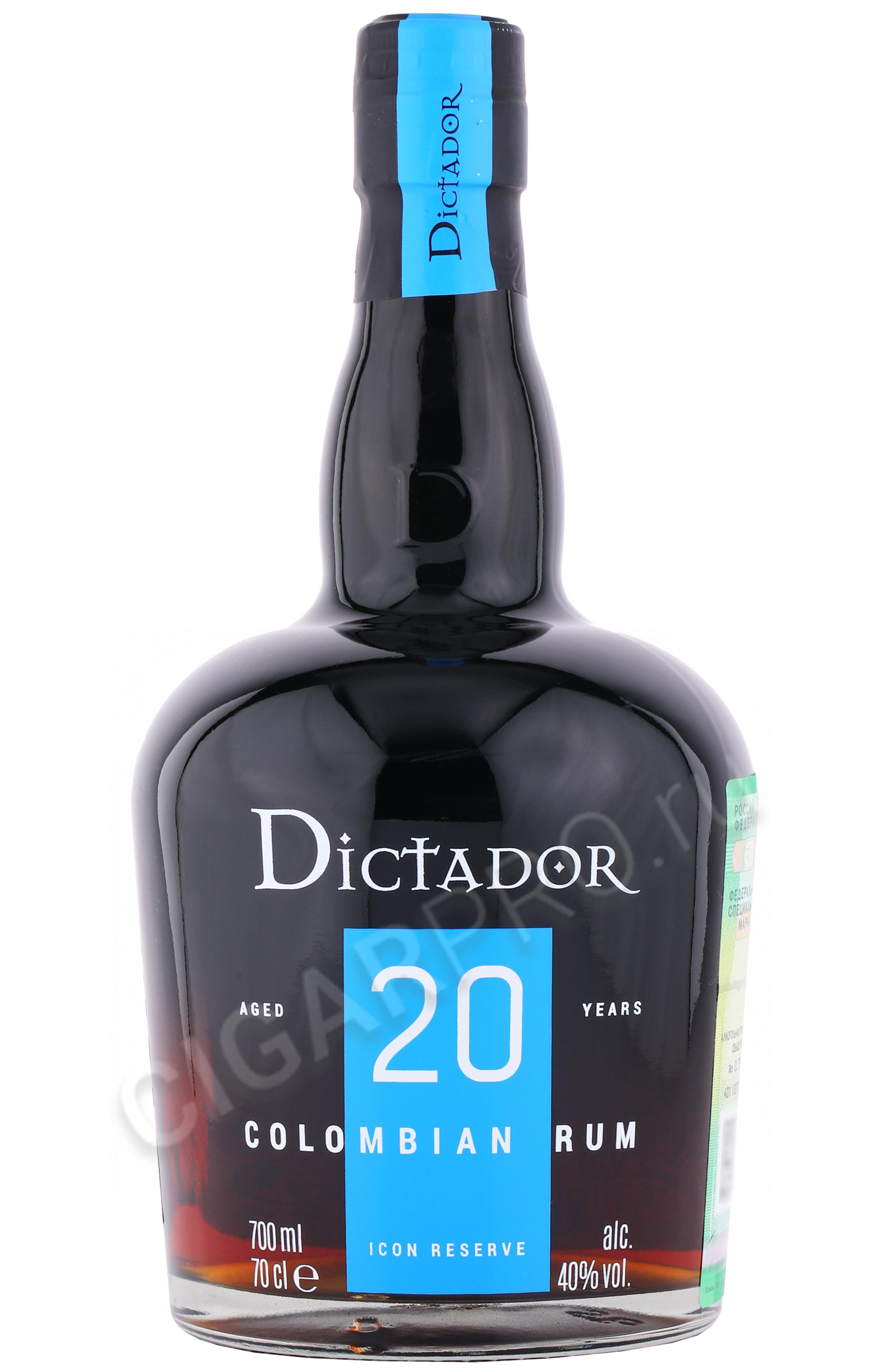 Ром Dictador 20 Years Old Distillery Icon Reserve 0,7 л – колумбийский крепкий напиток премиального сегмента в изумительной черной матовой бутылке эксклюзивного дизайна, который изготавливается исключительно из превосходного тростникового сиропа путем неполного брожения в аламбиках из меди с последующей ферментацией в конусообразных резервуарах из стали. Полученные дистилляты дозревают на протяжении 20 лет в старых дубовых емкостях. Ром Диктатор 20 лет обладает значительным количеством золотых медалей различных уважаемых конкурсов.