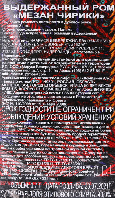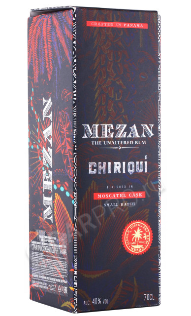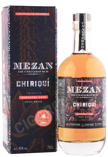 Ром Мезан Чирики - это мягкий ром на основе черной патоки сахарного тростника, дистиллированный в современных многоколонных перегонных кубах. Винокурня выращивает собственный тростник для производства сорта Агуардьенте для рома, а также выращивает определенные культуры дрожжей, которые добавляют характер и индивидуальность в роме. Ром Чирики был выдержан во второй раз в бочках из-под Москателя, чтобы придать рому дополнительную богатую структуру.