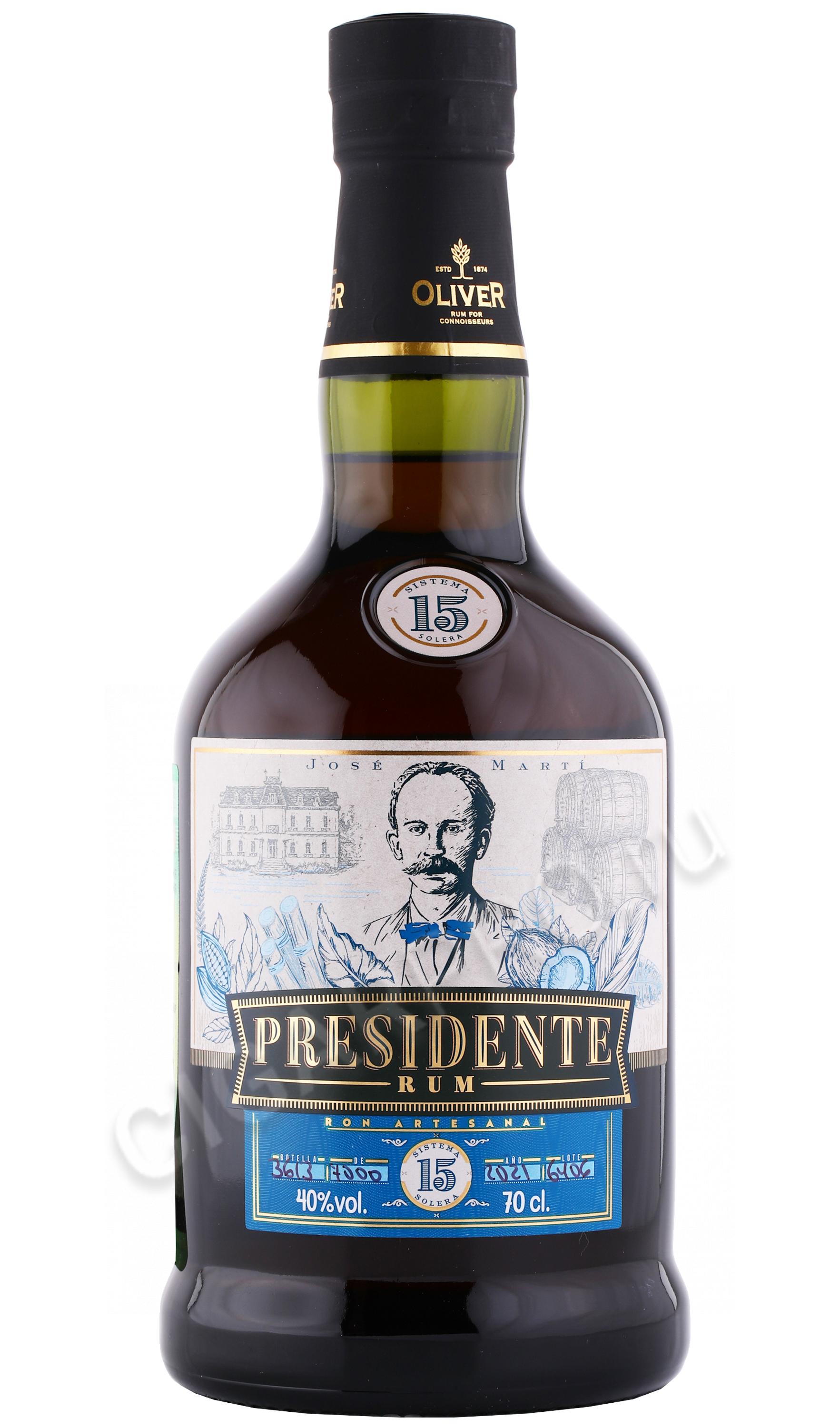 Ром Presidente Marti Oliver 15 лет представлен в линейке, посвященной Хосе Хулиану Марти Пересу — национальному герою Кубы, боровшемуся за ее независимость. Линейка ромов Presidente в исполнении 15-летней выдержки минимальных в купаже спиртов не нуждается в PR-мероприятиях. Семья Оливер кубинского происхождения как и все кубинцы чтят память и любят поэта, философа и революционера Хосе Марти, который и изображен на этикетках. Ром Presidente выдерживается в бочках из американского и французского дуба и обладает мягким сбалансированным вкусом с нотками ванили, банана, ананаса и табака. Производство сорокаградусного напитка класса «элит» осуществилось по традиционной технологии перегонки, а выдержка сроком 15 лет прошла в дубовых бочонках по системе Solera. 700-миллилитровая стеклянная бутылка с ромом комплектуется подарочным картонным боксом, украшенным портретом Хосе Хулиана Марти Переса.