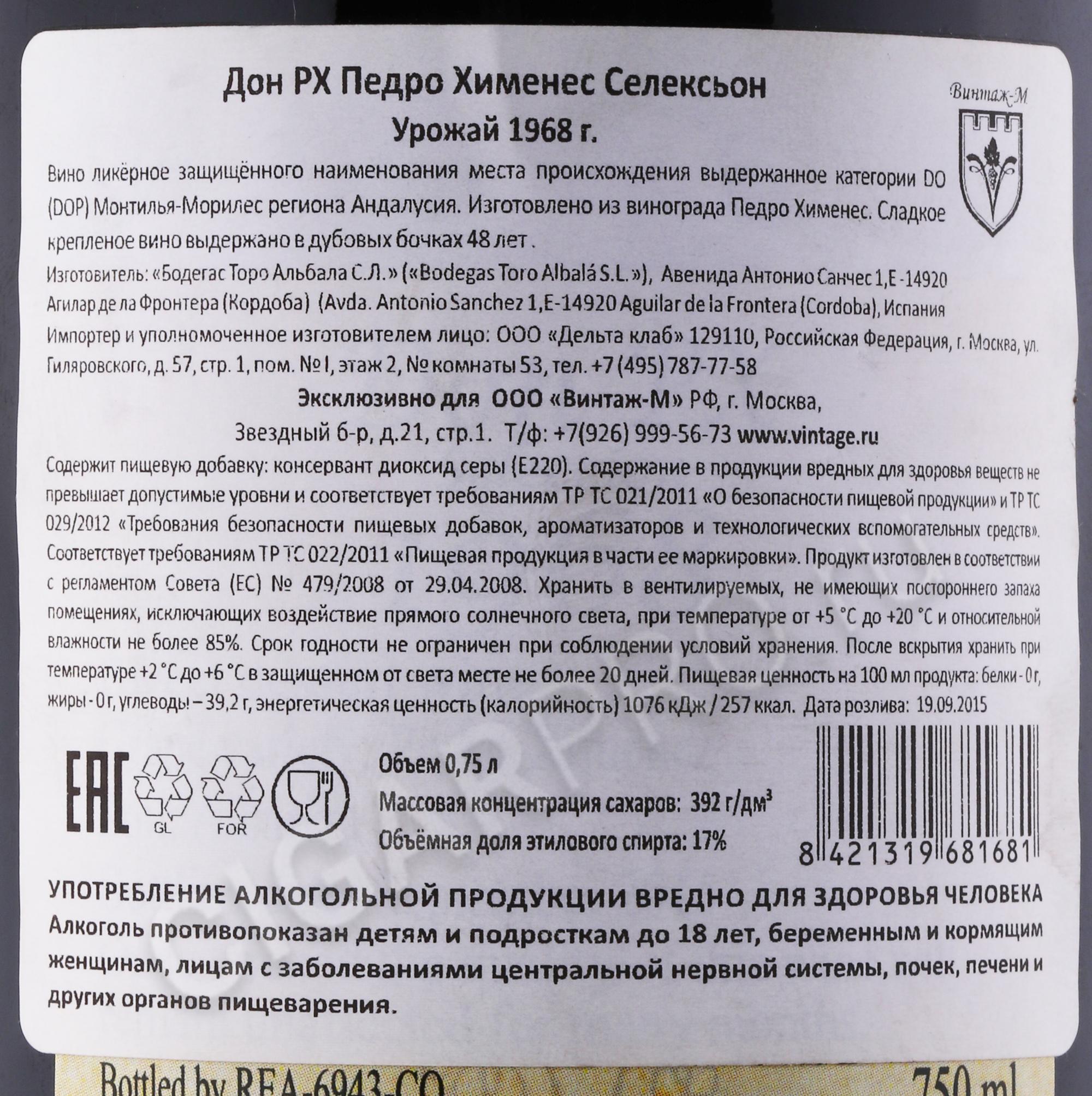 Toro Albala Don PX Seleccion 1968 Херес Дон ПХ Селексьон 1968г 0.75л