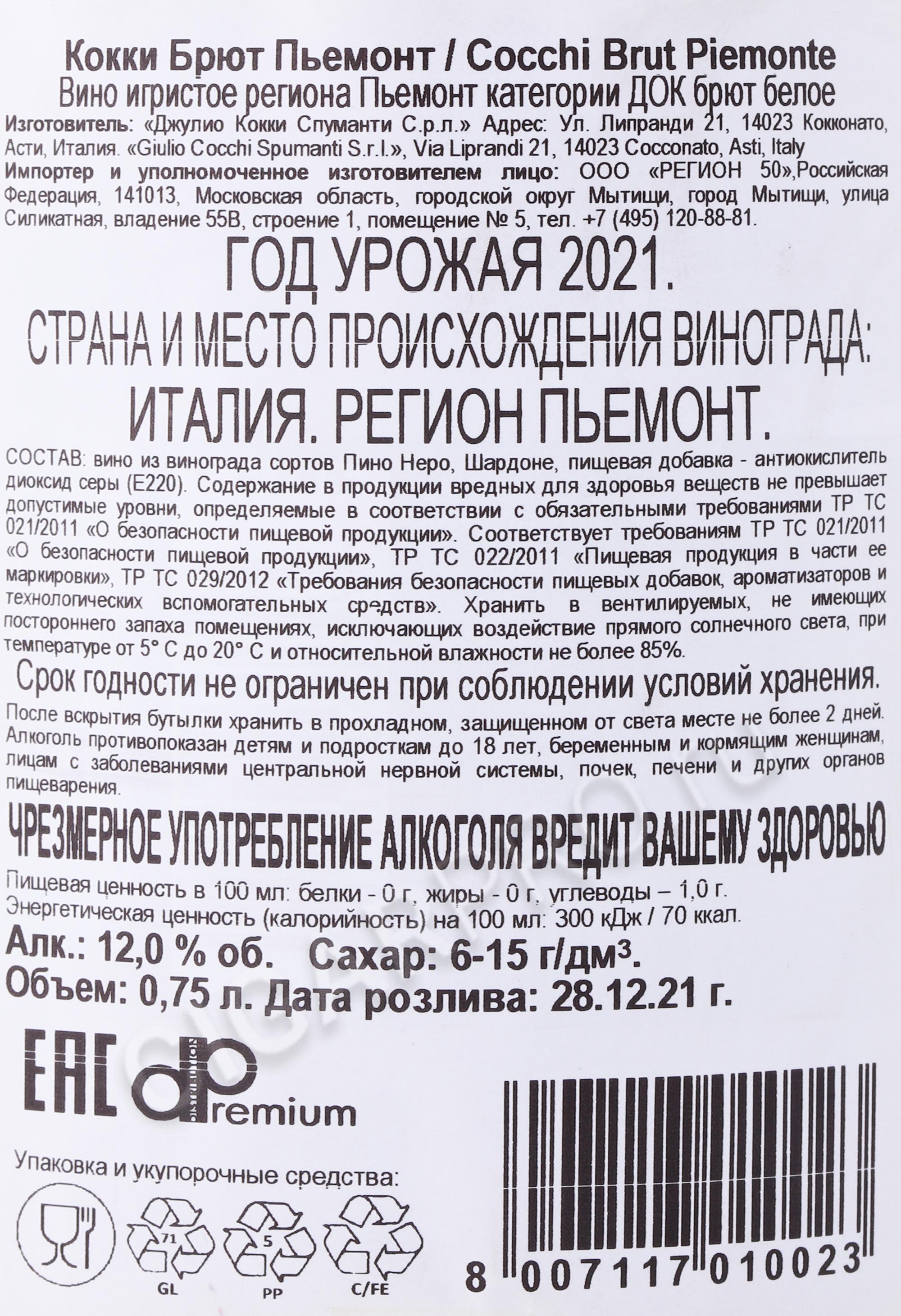 - Cocchi Brut Piemonte DOC Игристое вино Кокки Брют Пьемонт ДОК 0.75л