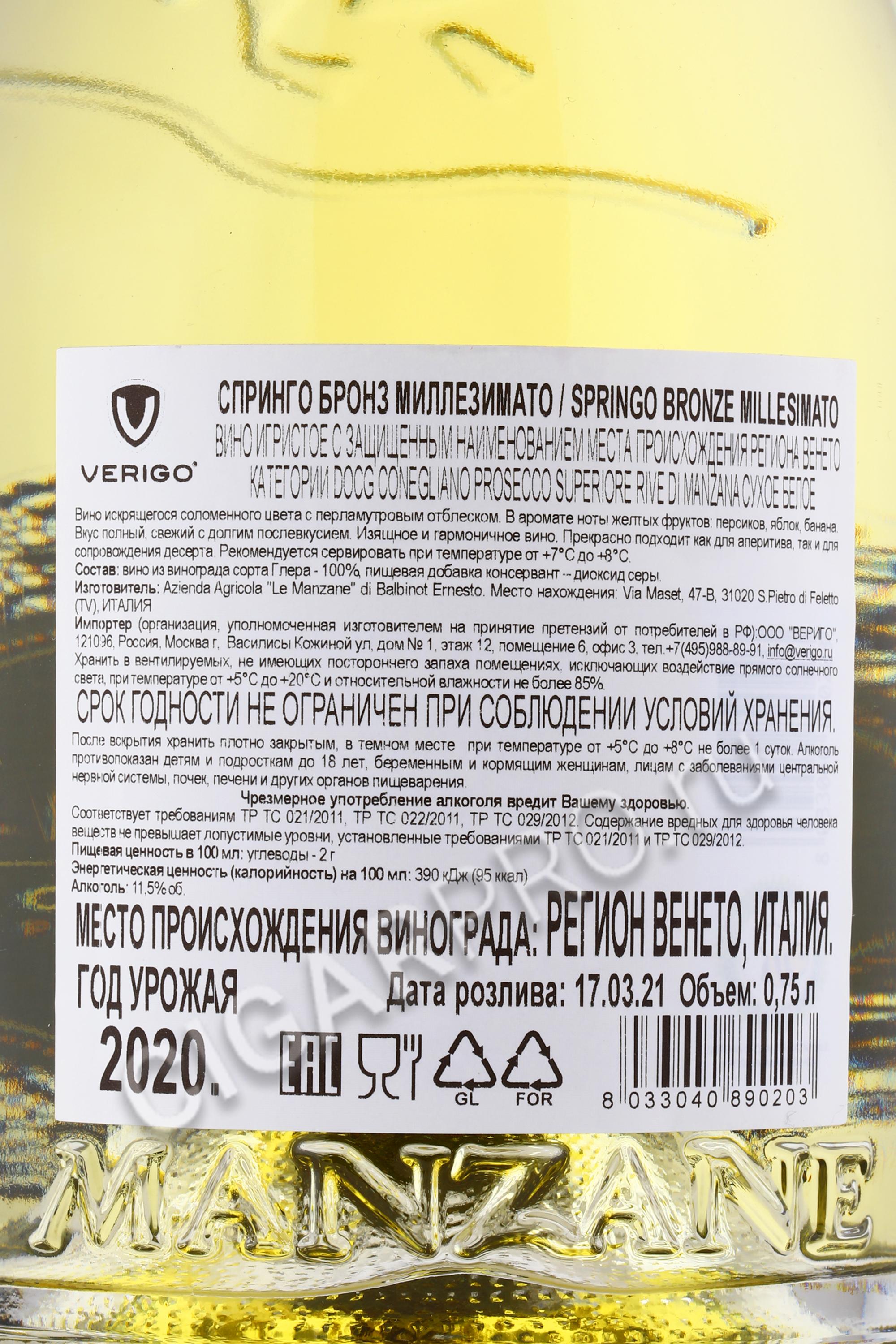 Le Manzane Springo Conegliano Prosecco Superiore Игристое вино Просекко Ла Манзане Спринго Конеглиано Супериоре 0.75л