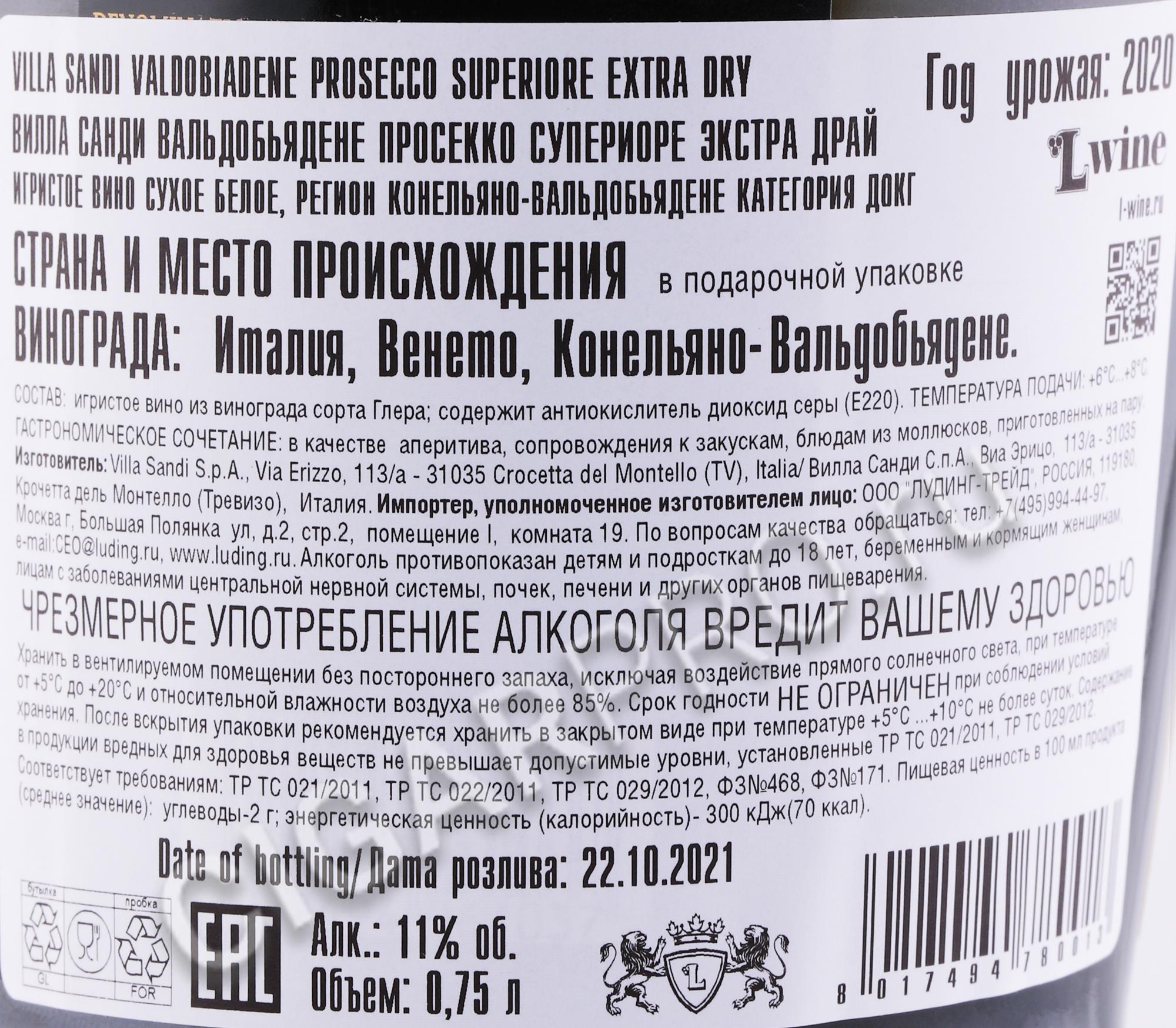 - Villa Sandi Valdobbiadene Prosecco Superiore Extra Dry Игристое вино Вилла Санди Вальдобьядене Просекко Супериоре Экстра Драй 0.75л в подарочной упаковке