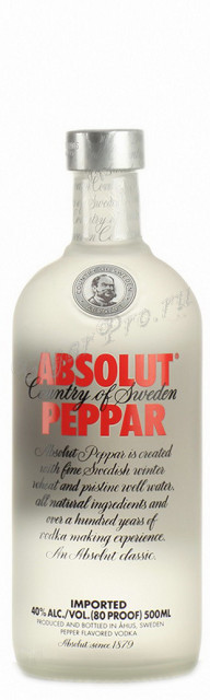 Absolut Peppar 0,5l — идеальное решение для любителей острых ощущений: пикантные нотки сортов перца «чили», «халапеньо» и «зеленый колокольчик» превращают традиционную водку в великолепный горячительный напиток. Премиальный продукт выполнен исключительно из натуральных ингредиентов – чистой воды из артезианской скважины, шведской озимой пшеницы и натуральных перцев разных сортов. Крепкий алкогольный напиток появился на мировом рынке в 1986 году. Создавался он как основной компонент коктейля «Кровавая Мэри», но со временем утвердился как самостоятельный напиток и обзавелся целой армией поклонников. Насыщенный перечный вкус идеально сочетается с классическим водочным букетом. Гурманы высоко оценили качественный продукт с насыщенным вкусом и продолжительным послевкусием, оттененным пикантной остротой. Absolut Peppar принято подавать охлажденным до температуры не более 3-5 градусов. Идеальной закуской к перцовой водке являются красная икра, балык из осетрины и другие рыбные деликатесы. Водка предлагается в легко узнаваемой бутылке «аптечно»-округлой формы объемом 0,5 л. На стеклянной таре есть подробная информация о происхождении спиртного напитка, чуть выше - медальон с изображением Ларса Ольсона Смита – водочного короля, чье бессмертное детище пользуется огромной популярностью во всем мире.