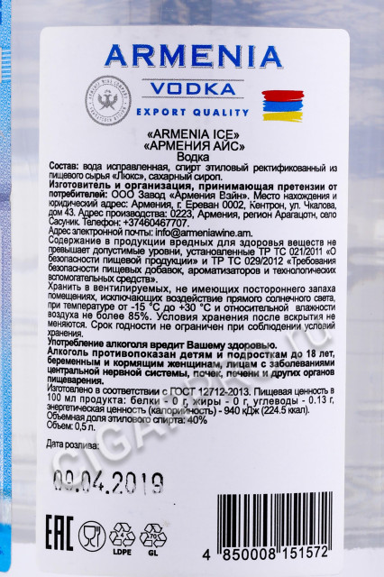 Armenia Ice – крепкий алкогольный напиток, воплощающий в себе лучшие традиции армянского водочного производства. Водка изготавливается на основе качественного спирта «Люкс», чистой воды и настоек на лаймовой цедре и зеленом чае. Благодаря удачному сочетанию вкусов получился новый оригинальный профиль с удивительно тонкими оттенками. Доминируют в водочном букете горьковато-свежие тона лайма и чистые травянистые нотки зеленого чая. Классический мягкий вкус дополнен легкой кислинкой, оставляющей приятное ощущение свежести в послевкусии. Кристально-прозрачная водка предлагается в стеклянной бутылке объемом 0.5 л. Спиртной напиток с безупречным качеством и оригинальным вкусом – незаменимый атрибут застолий. С такой водкой праздничная трапеза станет полноценной, приятной дегустации!