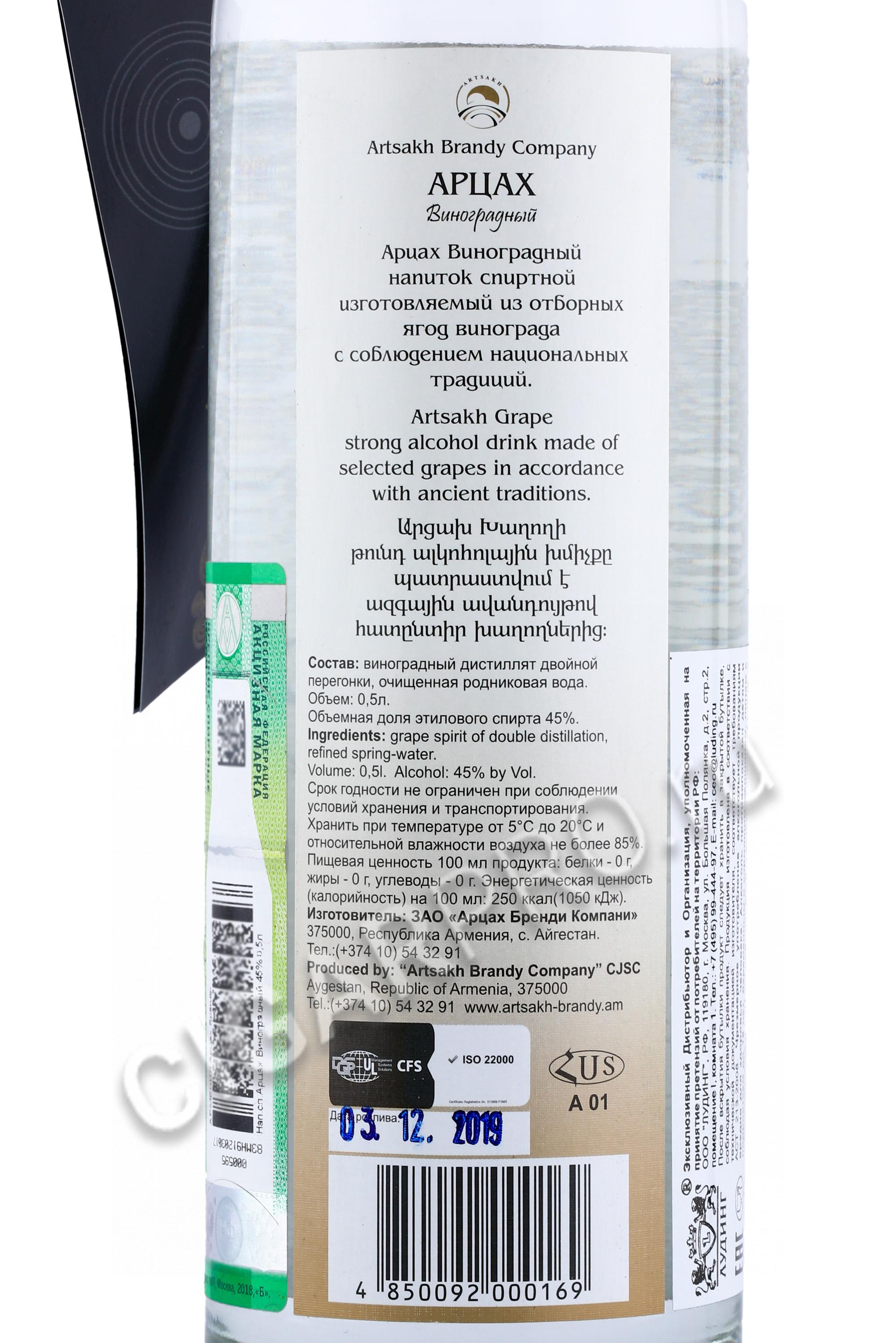 Арцах Виноградный 0,5 л – превосходный алкоголь из Армении с классическим вкусом. Напиток производится на основе белого винограда автохтонного сорта Ркацители, поэтому готовый алкоголь имеет совершенно неповторимый вкус и нежный аромат с сортовыми нотками и цветочными нюансами. Арцах Виноградный 0,5 л обладает крепостью 45%. Чтобы добиться этого, к чистейшему виноградному спирту, полученному в результате двойной перегонки, добавляется талая вода, которую берут в горах. Арцах Виноградный 0,5 л обретает идеальную чистоту и прозрачность благодаря мембранной фильтрации с последующим «отдыхом» перед розливом в течение 3 — 4 месяцев. Насыщенный букет и приятный вкус позволяют употреблять такую водку в чистом виде или готовить на его основе коктейли. В продажу Арцах Виноградный 0,5 л поставляется в фирменной стеклянной бутылке с информативной этикеткой.