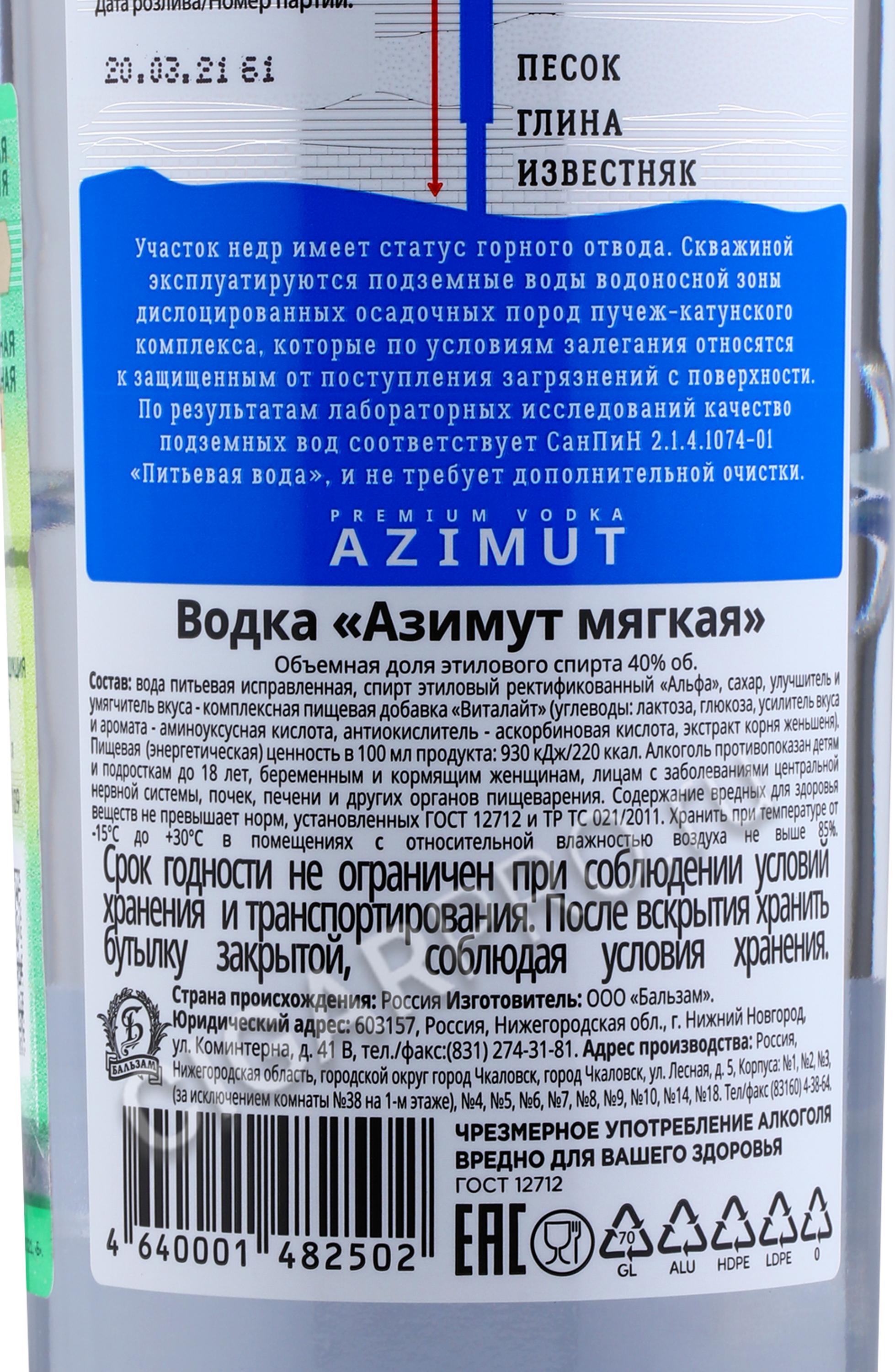 Водка «Азимут» это высококачественный продукт производимый из спирта «Альфа» и чистейшей артезианской воды.