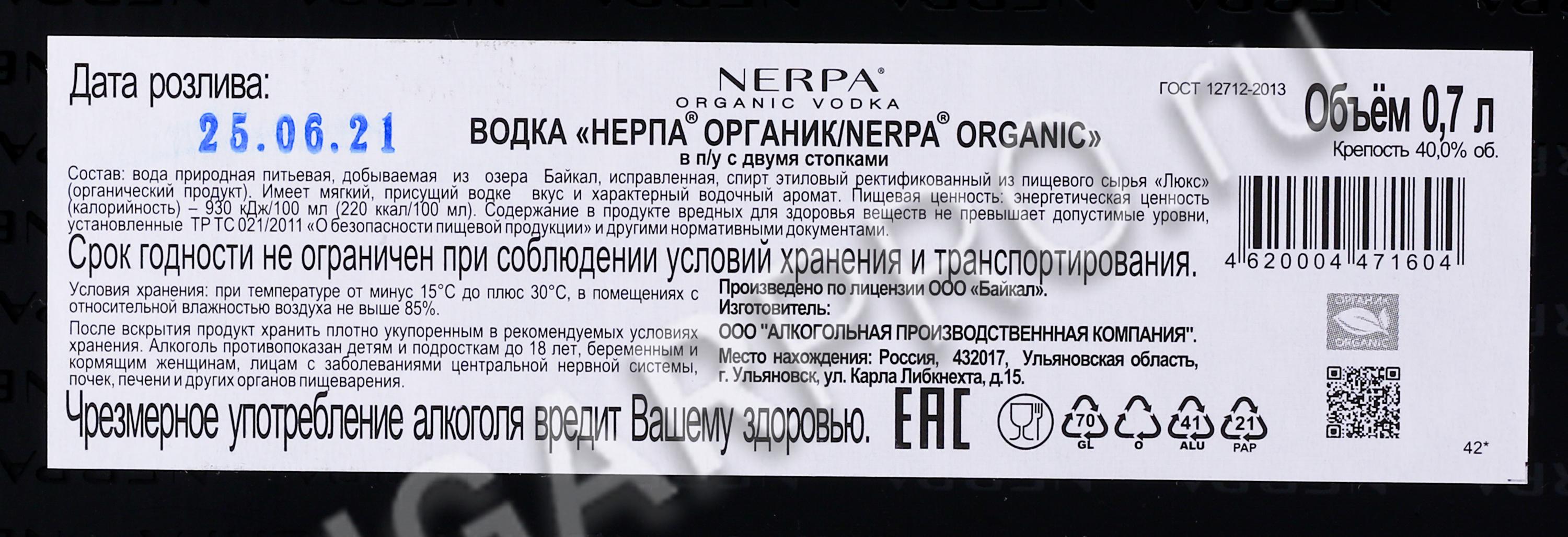 Baikal Nerpa Organic Водка Байкал Нерпа Органик + 2 рюмки 0.7л