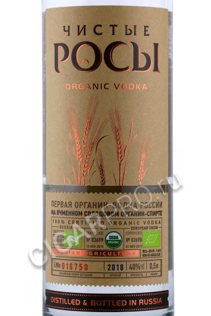 «Чистые Росы из ячменного зерна» – новый продукт линейки органических водок ТМ «Чистые Росы». Все этапы производства органик-водки «Чистые Росы из ячменного зерна» сертифицированы по органик-стандартам России, США и Евросоюза.Отборный ячмень выращен в естественных условиях на полях экохозяйства «Биосфера» (Республика Мордовия), почвы которого прошли органик-сертификацию и не подвергались воздействию удобрений в течение 18 лет.
