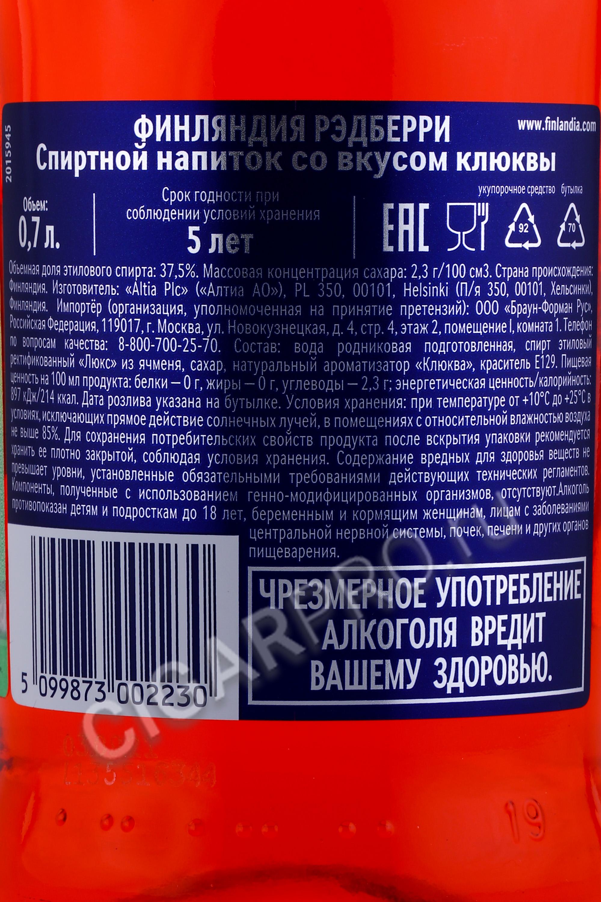 Finlandia Redberry 0,7l — великолепный алкогольный напиток, который предлагается в красивой дизайнерской бутылке с выпуклыми гранями. Этот качественный алкоголь выпускается в Финляндии, но пользуются огромной популярностью во всем мире. Финляндия Редберри 0,7 л порадует гурмана интенсивным красным цветом и бесподобным ароматом засахаренных ягод и сдобы. Вкус у напитка мягкий, с оттенками клюквы, с терпкостью кожуры грейпфрута и еловой хвои в послевкусии. Пить Финляндия Редберри 0,7 л можно как в чистом виде, так и в составе коктейлей с добавлением клюквенного, грейпфрутового или гранатового сока, льда и кружочка лайма. Водка Финляндия Редберри 0,7 л – отличный подарок к юбилею.
