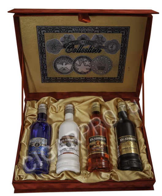 Набор Калашников Премиум представленн в четырёх видах миниатюрной водки в бархатной коробке. Каждая бутылка имеет индивидуальный цвет, каждый вкус имеет свои особенности. Элегантная коробка будет прекрасным подарком как для колекционера алкоминималистики так и для близких вам людей. Актуальный подарок к 23 февраля.