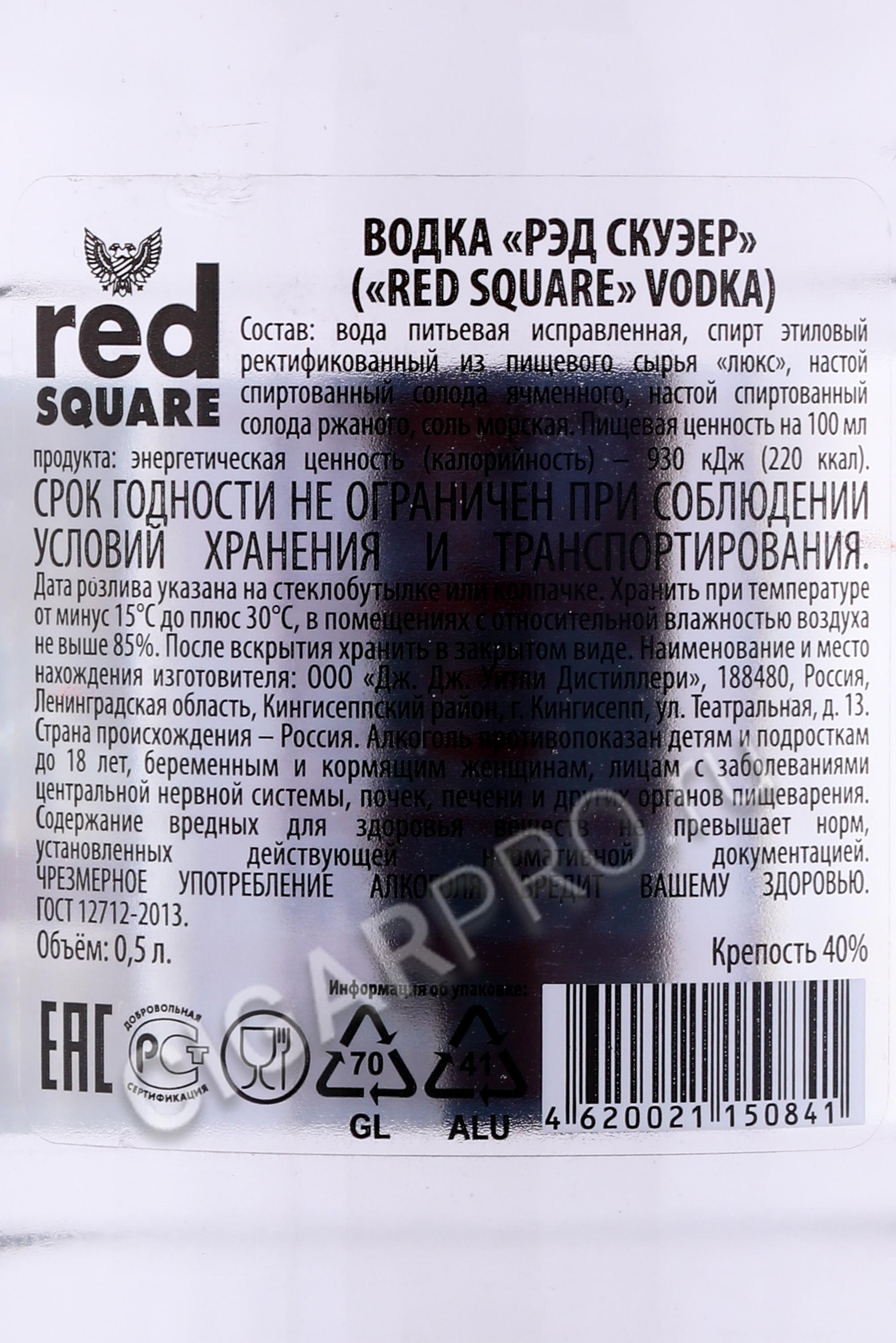 Водка Red Square 0,5 л производится из смеси пшеничного и ржаного зерна, выращенного на российских просторах. Из тщательно отобранного сырья путем многократной перегонки изготавливаются спирты, которые затем проходят трехступенчатую очистку через угольные фильтры. Напиток разливается в прозрачную бутылку из стекла, дизайн которой разработан по индивидуальному заказу. Емкость выделяется красной этикеткой и крышкой того же цвета.