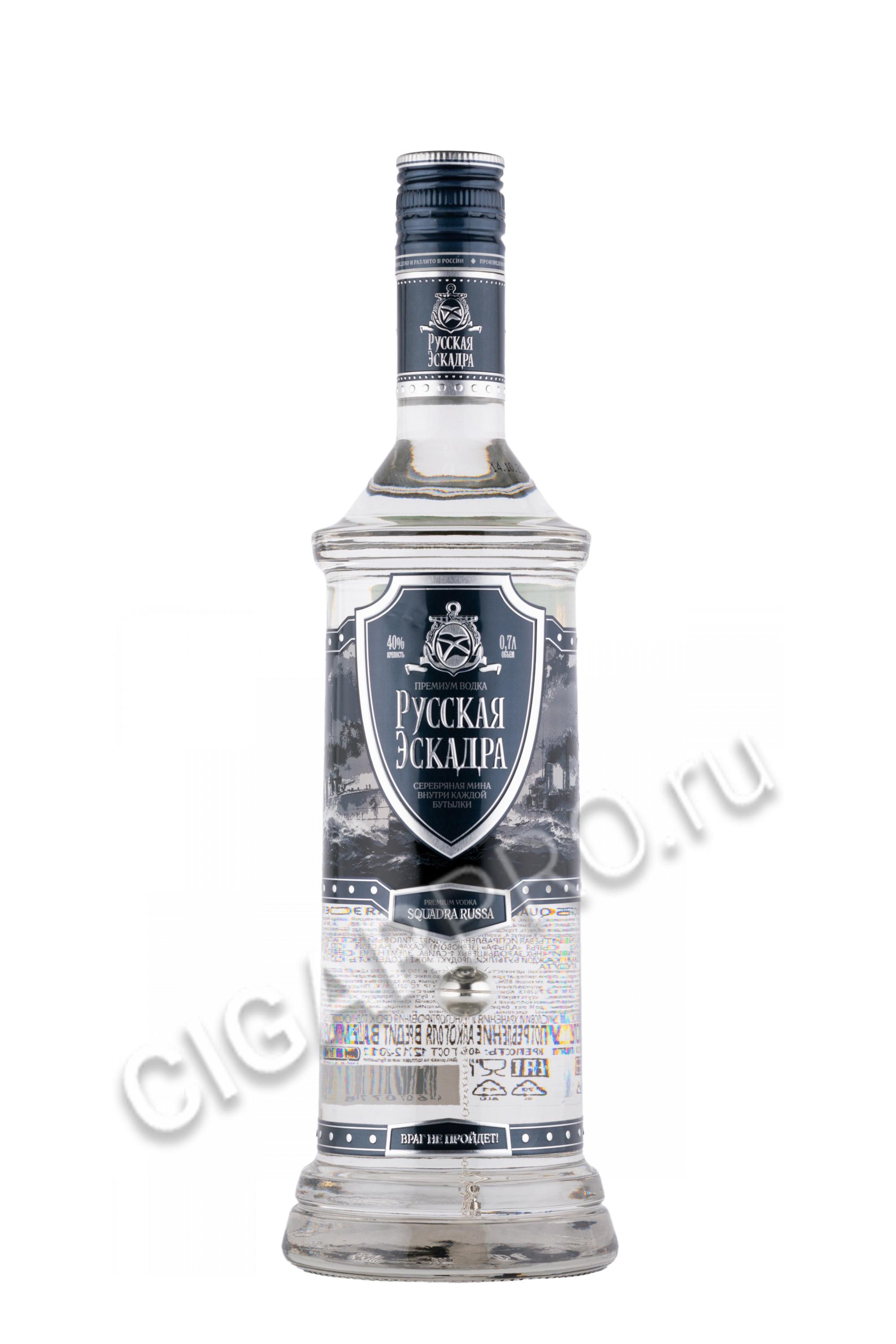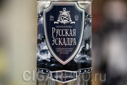 Водка «Русская эскадра» привлекает потребителя не столько качеством хорошего классического напитка, сколько оригинальными решениями дизайна. Искусно сделанная из серебра высшей пробы модель глубоководной мины, военного самолёта, танка Т-34 или крейсера, находится на дне каждой бутылки. Водка произведена из спирта сырья “Альфа», высшей очистки. Аромат насыщенный, но не резкий. Вкусы - лёгкие блики фруктозы с приятным длительным послевкусием миндаля.