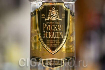 Водка «Русская эскадра» привлекает потребителя не столько качеством хорошего классического напитка, сколько оригинальными решениями дизайна. Искусно сделанная из серебра высшей пробы модель глубоководной мины, искустно покрыта тонким слоем золота. Водка произведена из спирта сорта “Альфа», высшей очистки. Аромат насыщенный, но не резкий. Вкусы - лёгкие блики фруктозы с приятным длительным послевкусием миндаля.