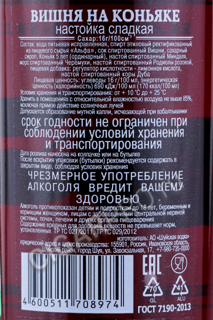 Изготовитель настилки АО «Шуйская Водка» в основу напитка вложил основной ингредиент спиртованный настой вишни, ректификованный спирт «Альфа», коньяк минимальными спиртами 5 лет, настой миндаля, спиртованный морс Черёмухи, настой спиртованный из золотого корня, и коры дуба.