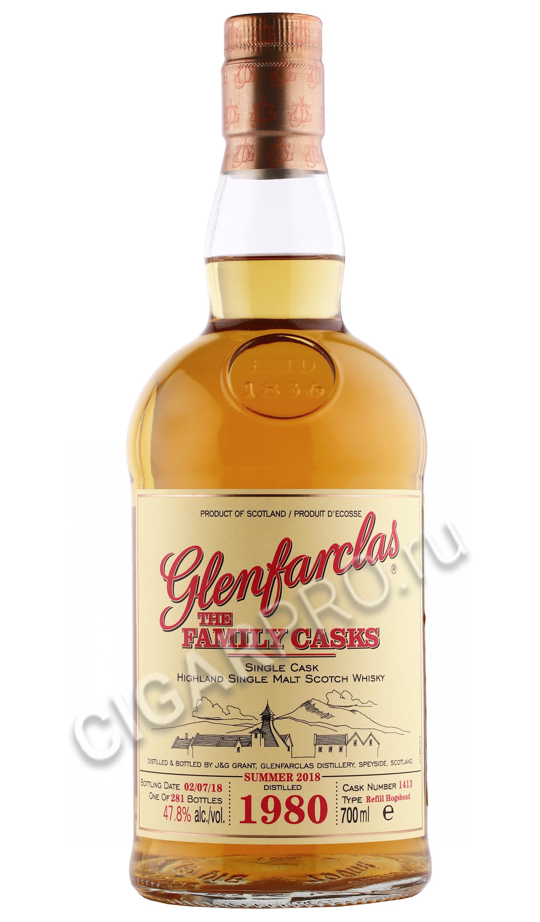 Виски Glenfarclas Family Casks 1980 год 0,7 л — премиальный шотландский миллезимный алкоголь, который обладает внушительной стоимостью, так как был выпущен ограниченной партией из 287 штук. Также на цену повлиял незаурядный букет напитка, сформированный после вызревания в хересных барриках на протяжении 36 лет и более. Скотч бочковой крепости, достигающей 48 градусов, состоит из отборных спиртов соложеного ячменя, поэтому является односолодовым. Его упаковкой служит деревянный подарочный бокс в узнаваемой стилистике линейки Фэмили Каскс.