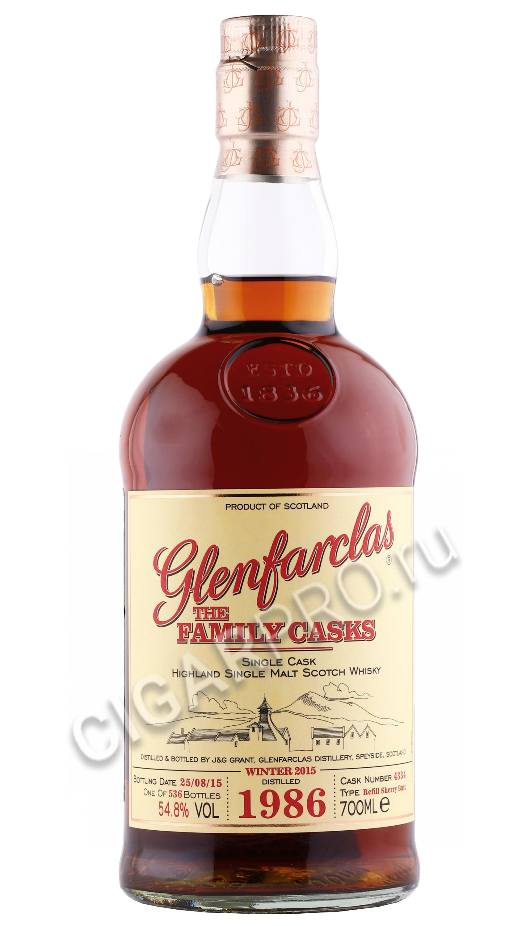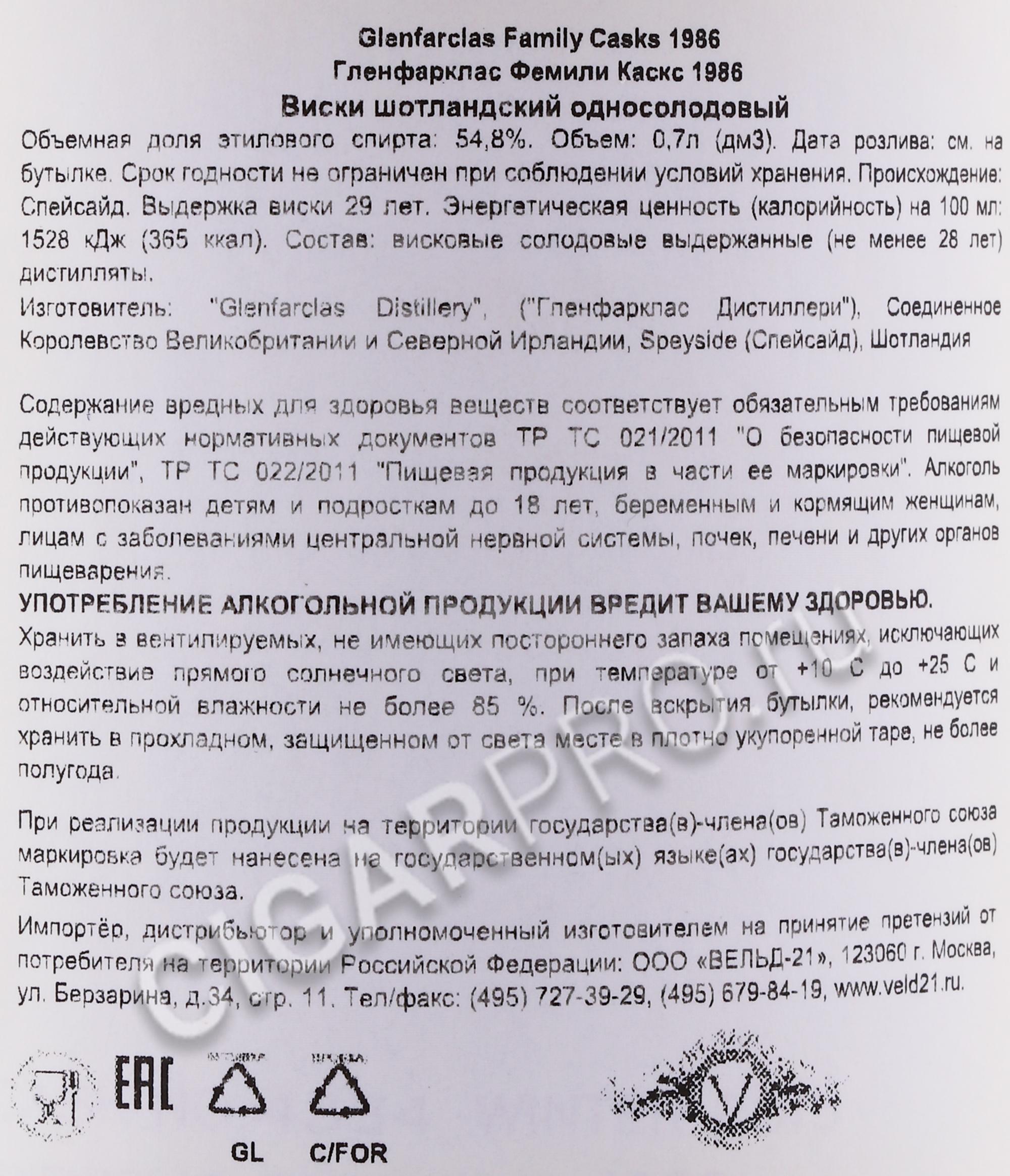 Виски Glenfarclas Family Casks 1986 г. 0,7 л — скотч очень высокой стоимости, который произвели малым тиражом из 536 бутылок, дополненных деревянными футлярами в стилистике известной шотландской дистиллерии. Элитный напиток бочковой крепости создали без холодной фильтрации на традиционном перегонном оборудовании и выдержали в хересной бочке 29 лет. Его состав включает только односолодовые спирты одинакового года производства из региона Speyside.