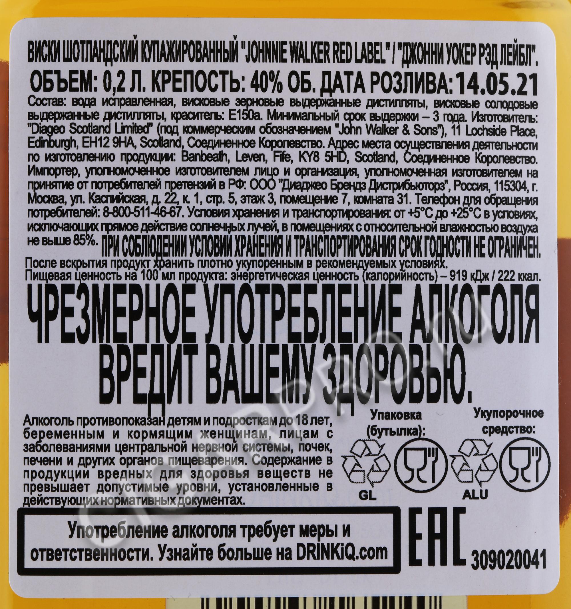 Johnnie Walker Red Label шотландский виски Джонни Уокер Рэд Лэйбл 0,2 л