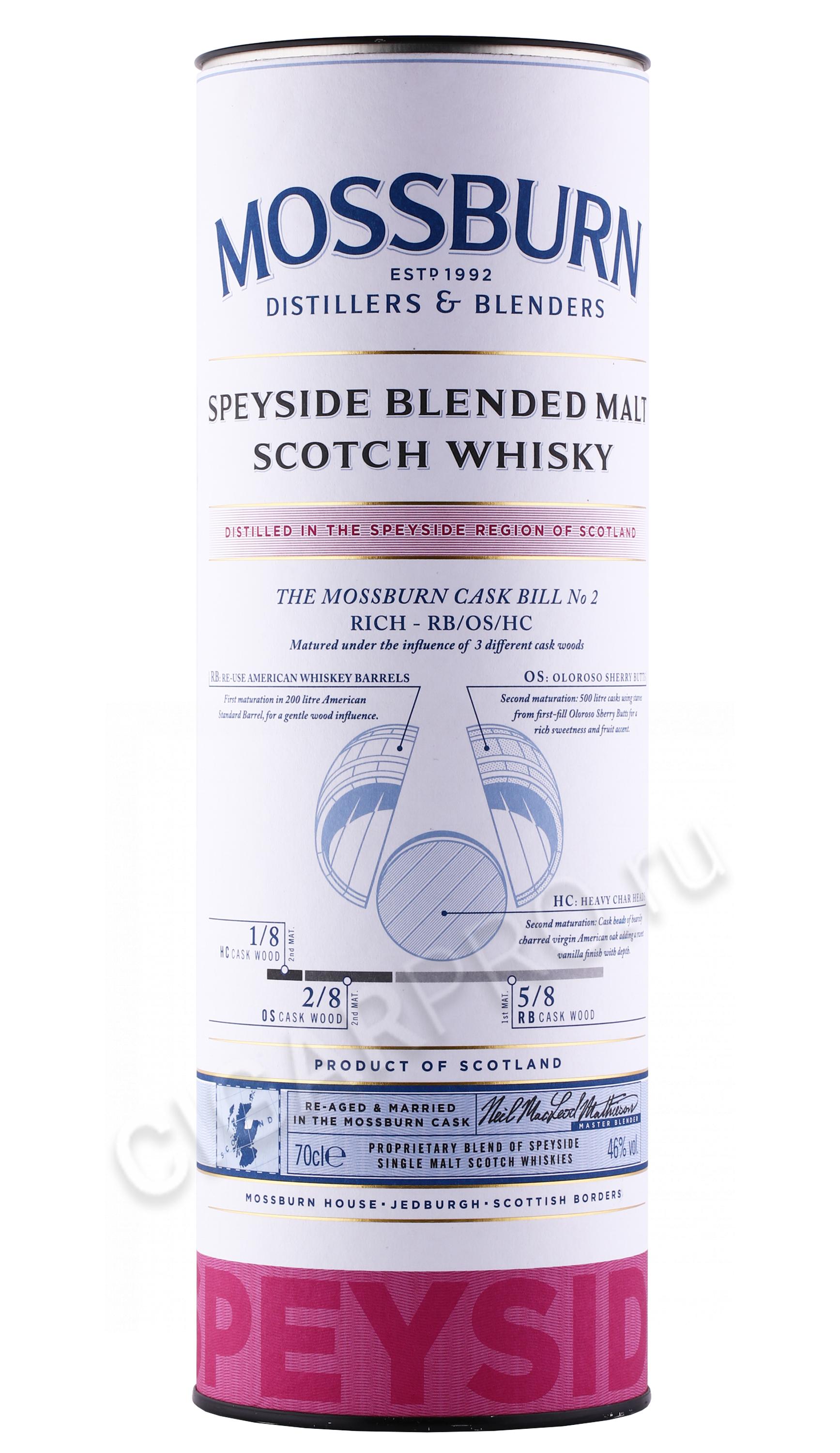 Виски солодовый Моссберн Блендед Молт Скотч Виски Спейсайд 3года 46% 0,7л в тубе Шотландия