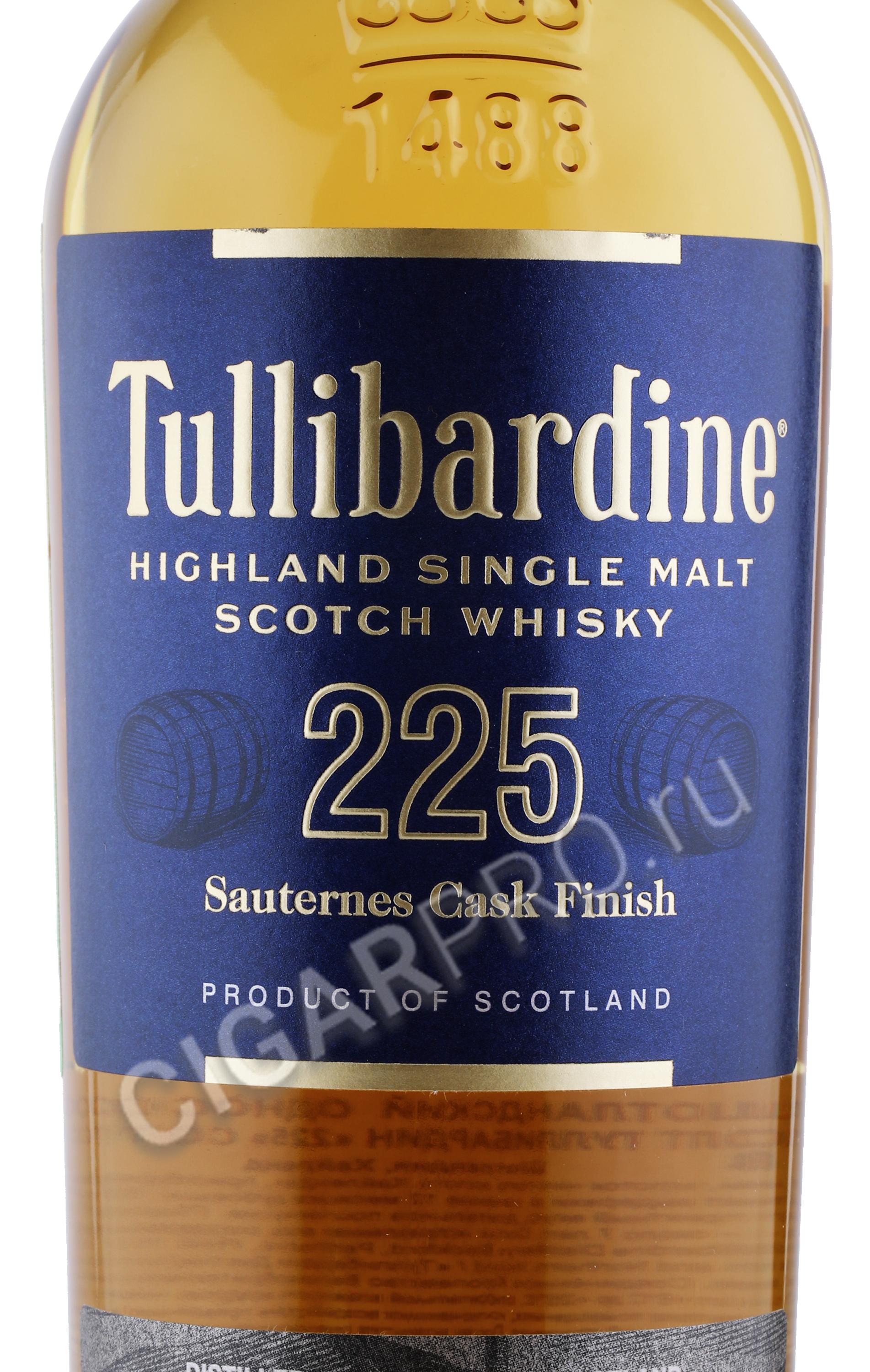 Виски Tullibardine 225 0,7 л — односолодовый шотландский сорт из региона Хайленд, который добавился в ассортимент производителя в 2013 году. Рецептура напитка является большим секретом, поэтому на этикетке не указывается продолжительность выдержки. Для созревания спиртов используются дубовые бочки объемом 225 литров — эта цифра вынесена в названии. Для финишной отделки дистилляты перемещают в емкости из французского дуба, которые ранее использовали для хранения сладкого вина Сотерн Chateau Suduiraut. В бутылки виски разливается без холодной фильтрации.
