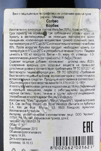 Masi Tupungato Corbec Вино Корбек Мази Тупунгато 0.75л