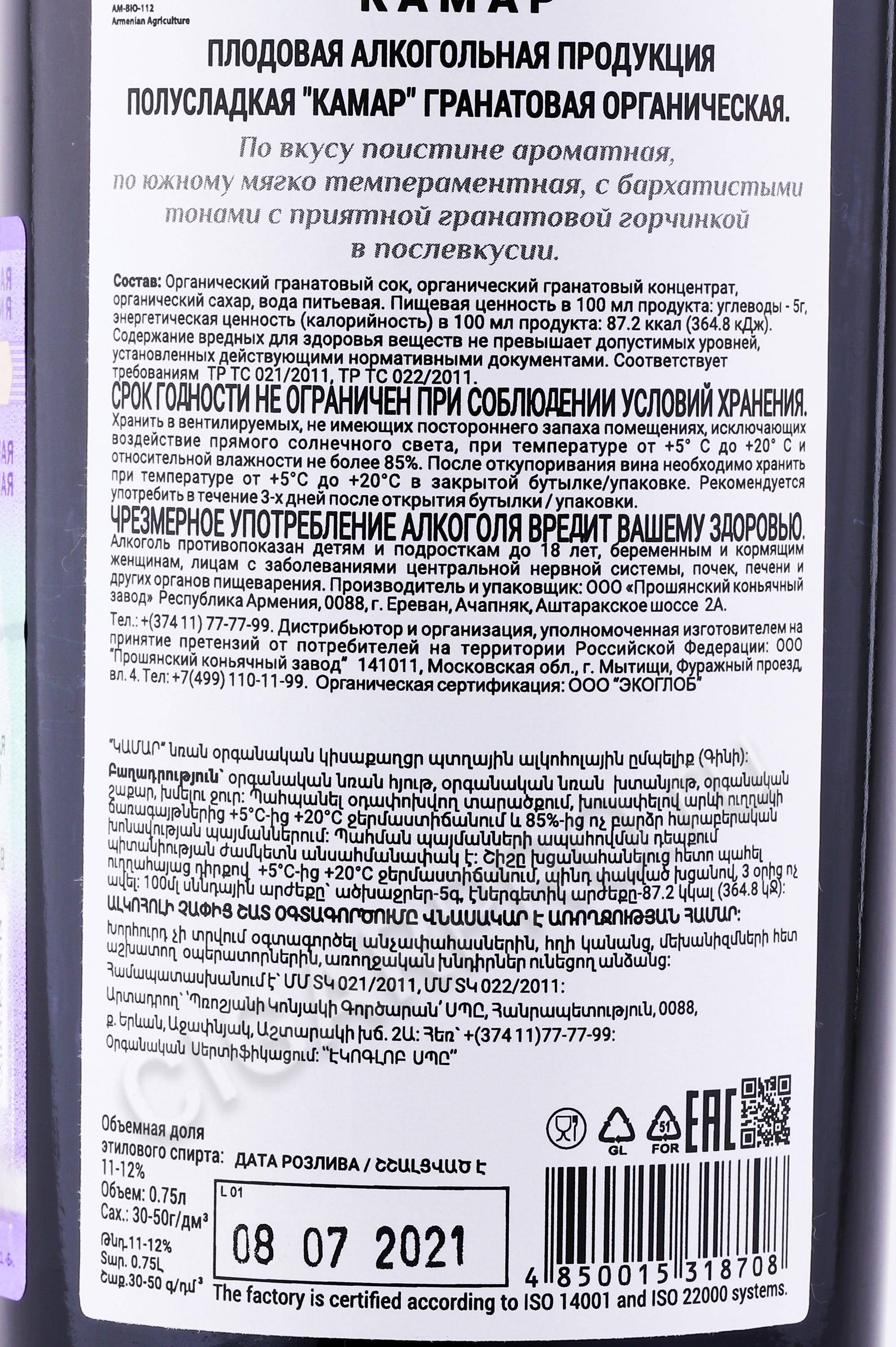 Kamar Pomegranate Organic Вино Камар органическое гранатовое Красное сухое 0.75л