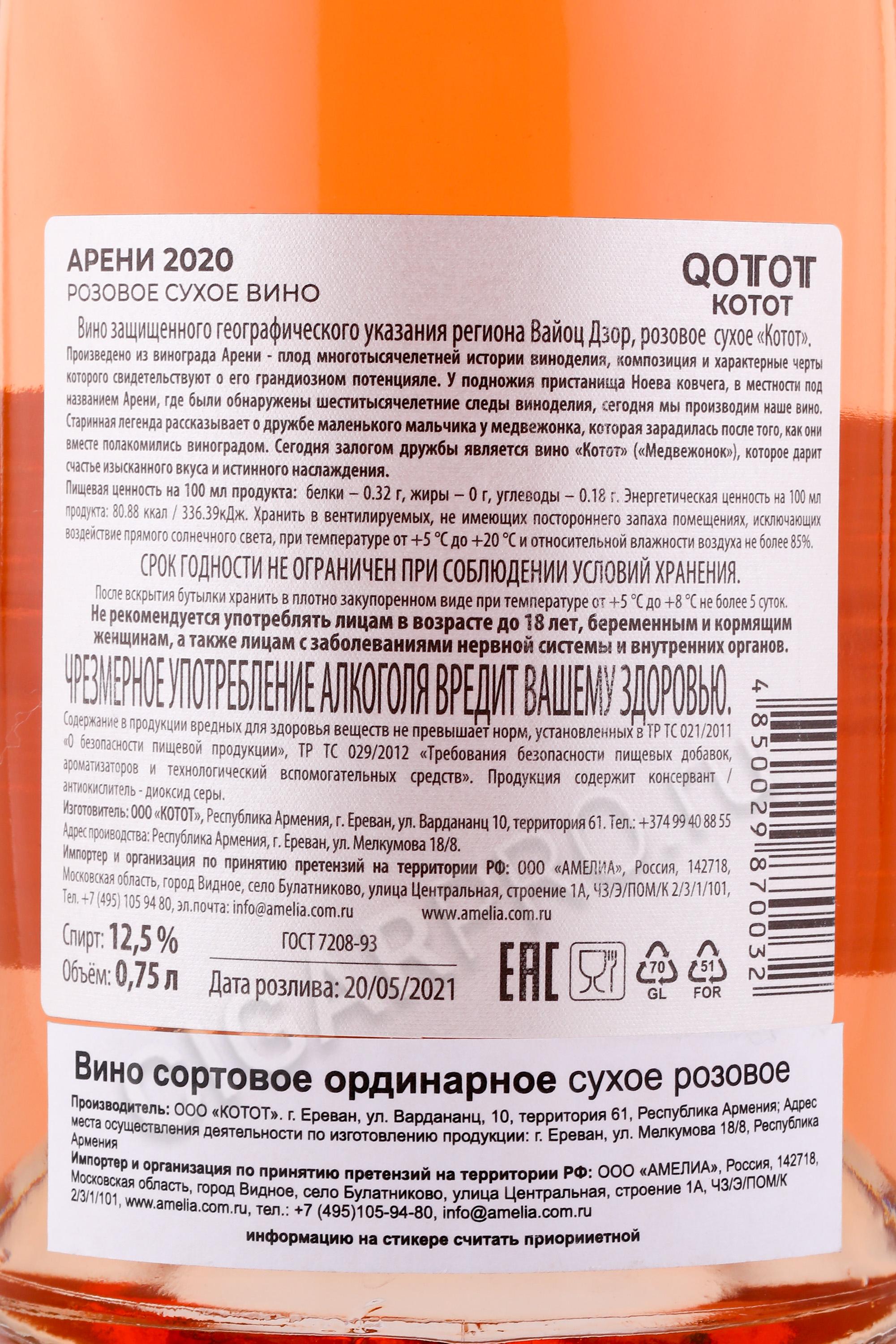 Данное розовое вино произведено из виноградного сорта Арени на территории виной компании «Котот», в Регионе Вайоц Дзор.