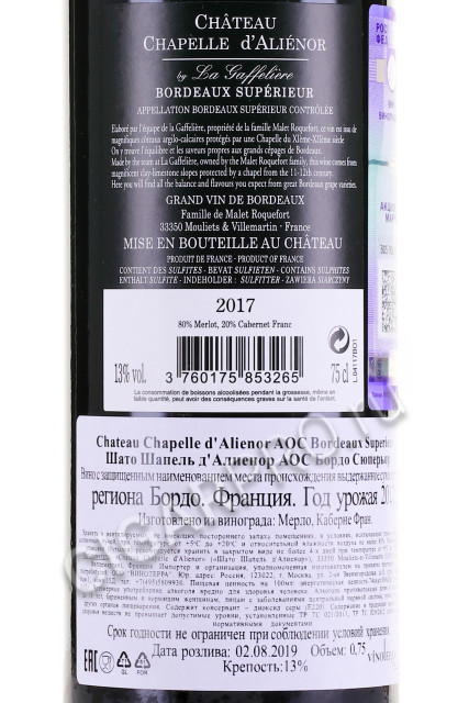 - Chateau Chapelle dAlienor Bordeaux Superieur AOC Вино Шато Шапель дАлиенор АОС Бордо Сюперьор 0.75л