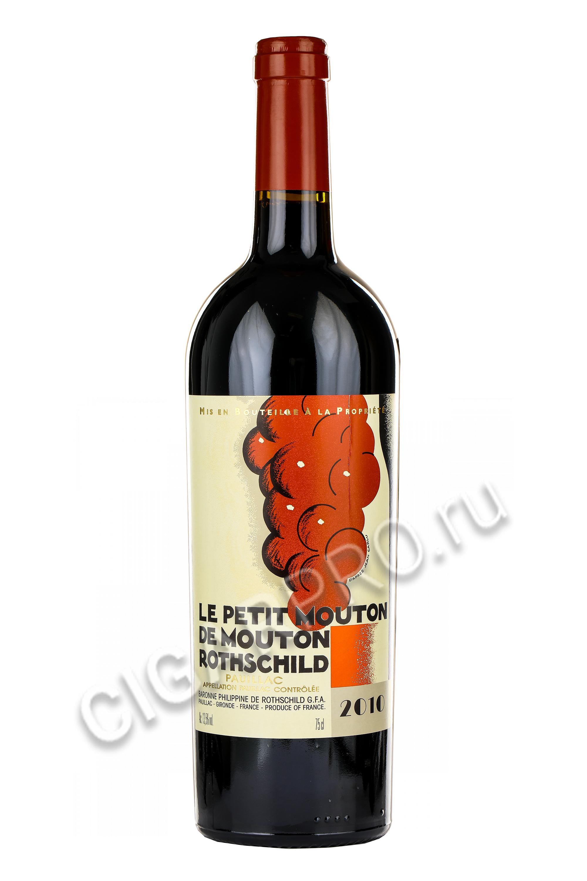 Вино Le Petit Mouton De Mouton Rothschild 2010 г — суперпремиальное спиртное крепостью 13,5 градуса, которое изготавливается одноименной компанией из французского региона Бордо, апелласьона Pauillac. Продукт красной сухой категории был создан из ягод трех сортов 2010 урожайного года, собранных вручную с молодых лоз. Обработка сырья прошла по методу яблочно-молочного брожения. Вино выдерживалось 22 месяца в отборных барриках из французского дуба. У него солидный потенциал хранения: 8-15 лет.