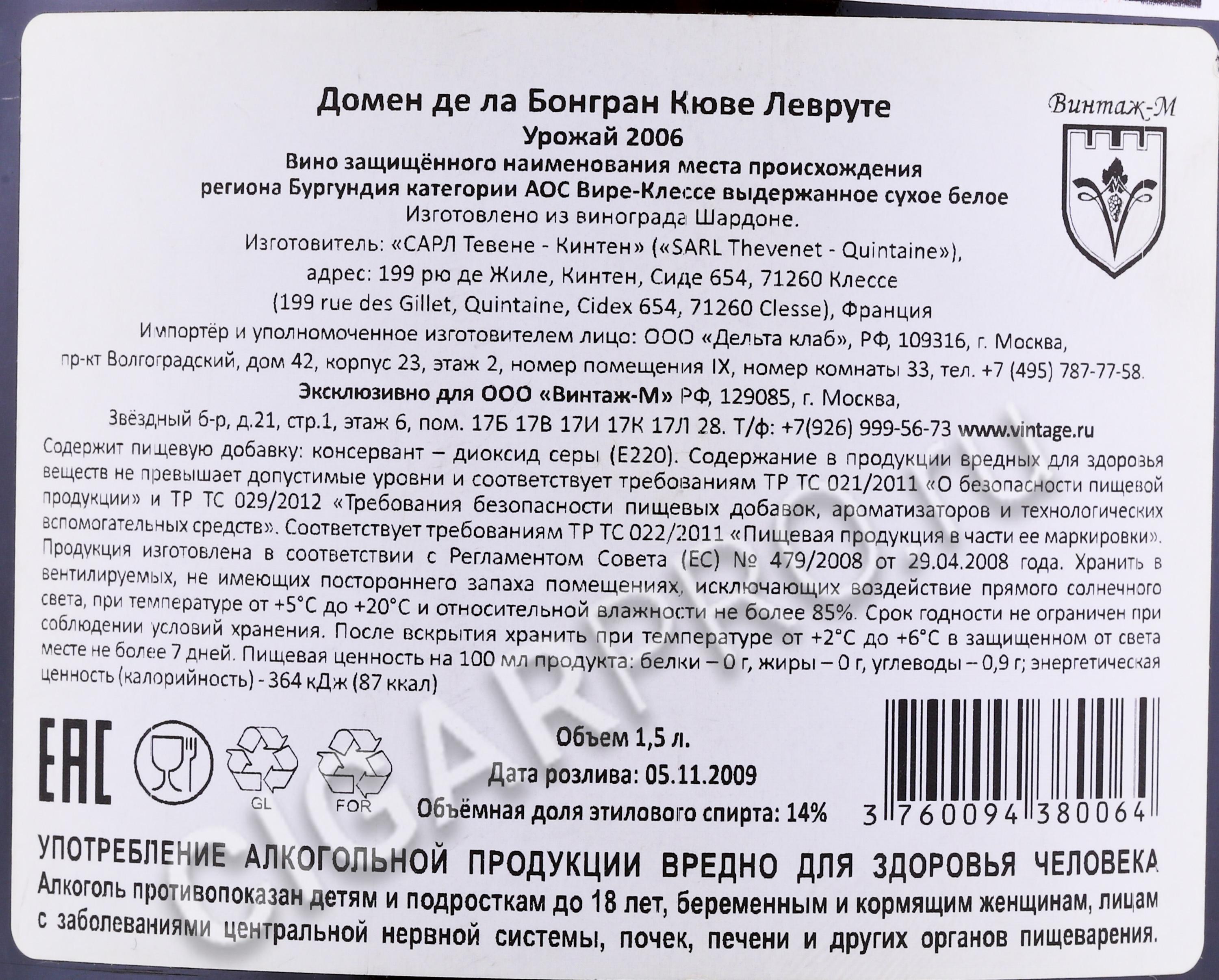 Domaine de la Bongran Cuvee Levroutee 2006 Вино Домен де Ла Бонгран Кюве Левруте 2006г 1.5л