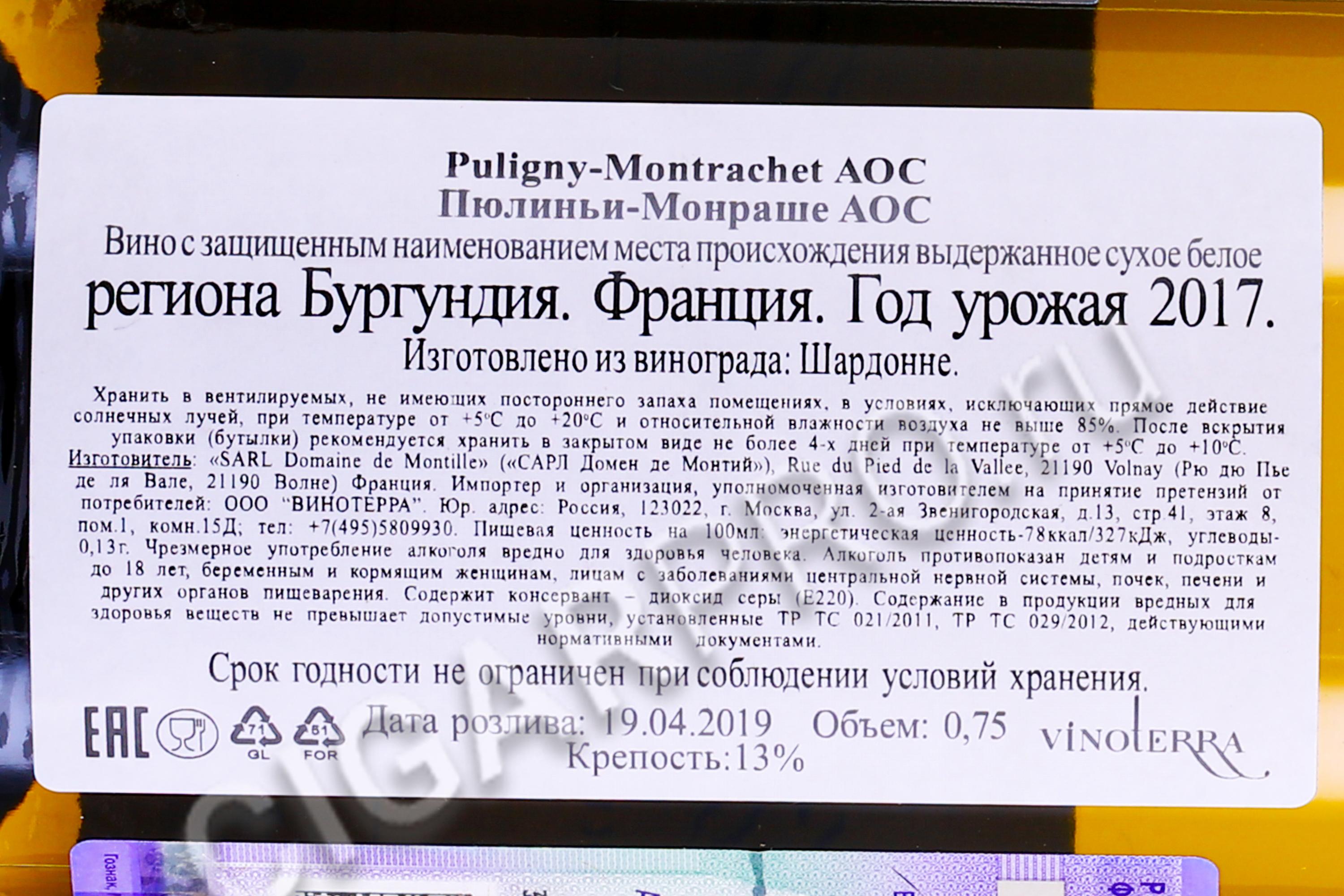 - Puligny Montrachet AOC Вино Пюлиньи Монраше АОС 2017 0.75л