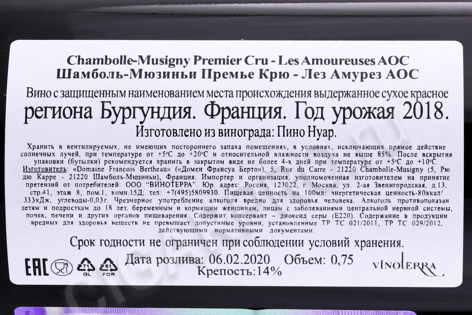 Chambolle Musigny Premier Cru Les Amoureuses АОС 2018 Вино Шамболь Мюзиньи Премье Крю Лез Амурез АОС 2018 0.75л