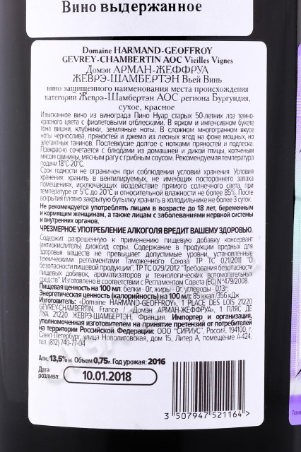 Domaine Harmand Geoffroy Gevrey Сhambertin Vieilles Vignes 2016 Вино Домэн Арман Жеффруа Жеврэ Шамбертэн Вьей Винь 2016г 0.75л
