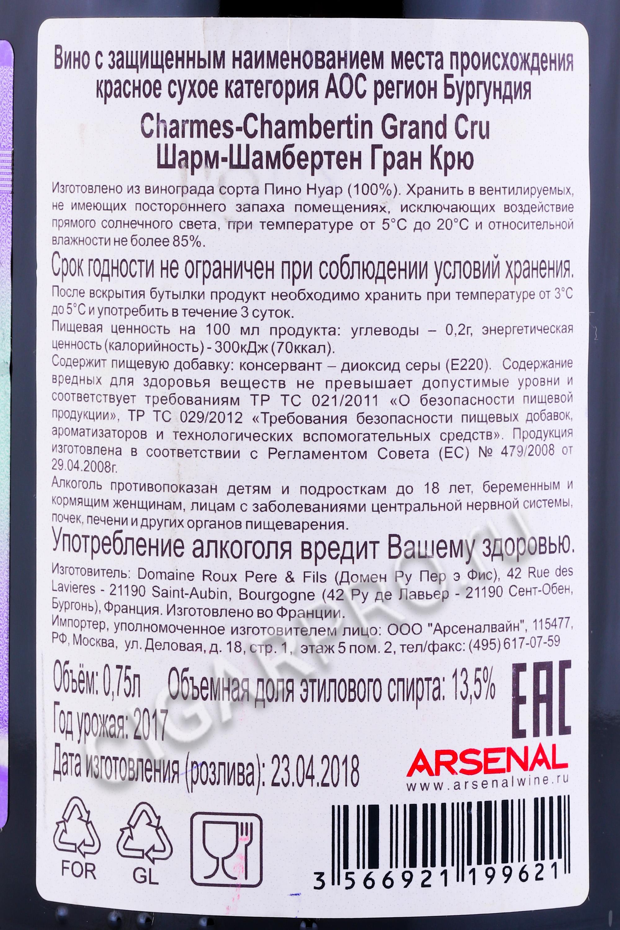 Roux Pere et Fils Charmes Chambertin Grand Cru Вино Ру Пэр э Фис Шарм Шамбертен Гран Крю