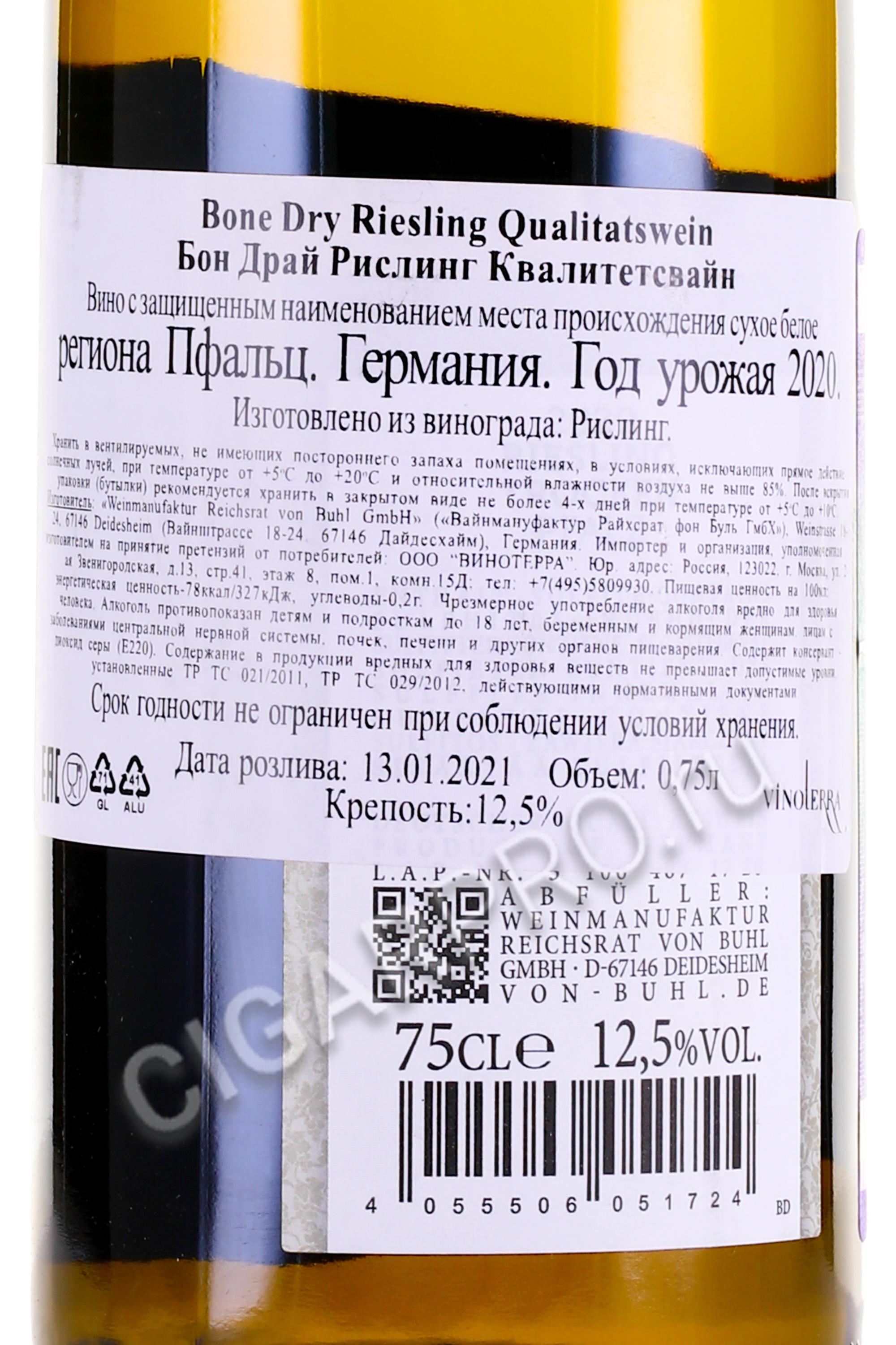 Bone Dry Riesling Qualitatswein Вино Бон Драй Рислинг Квалитетсвайн 0.75л