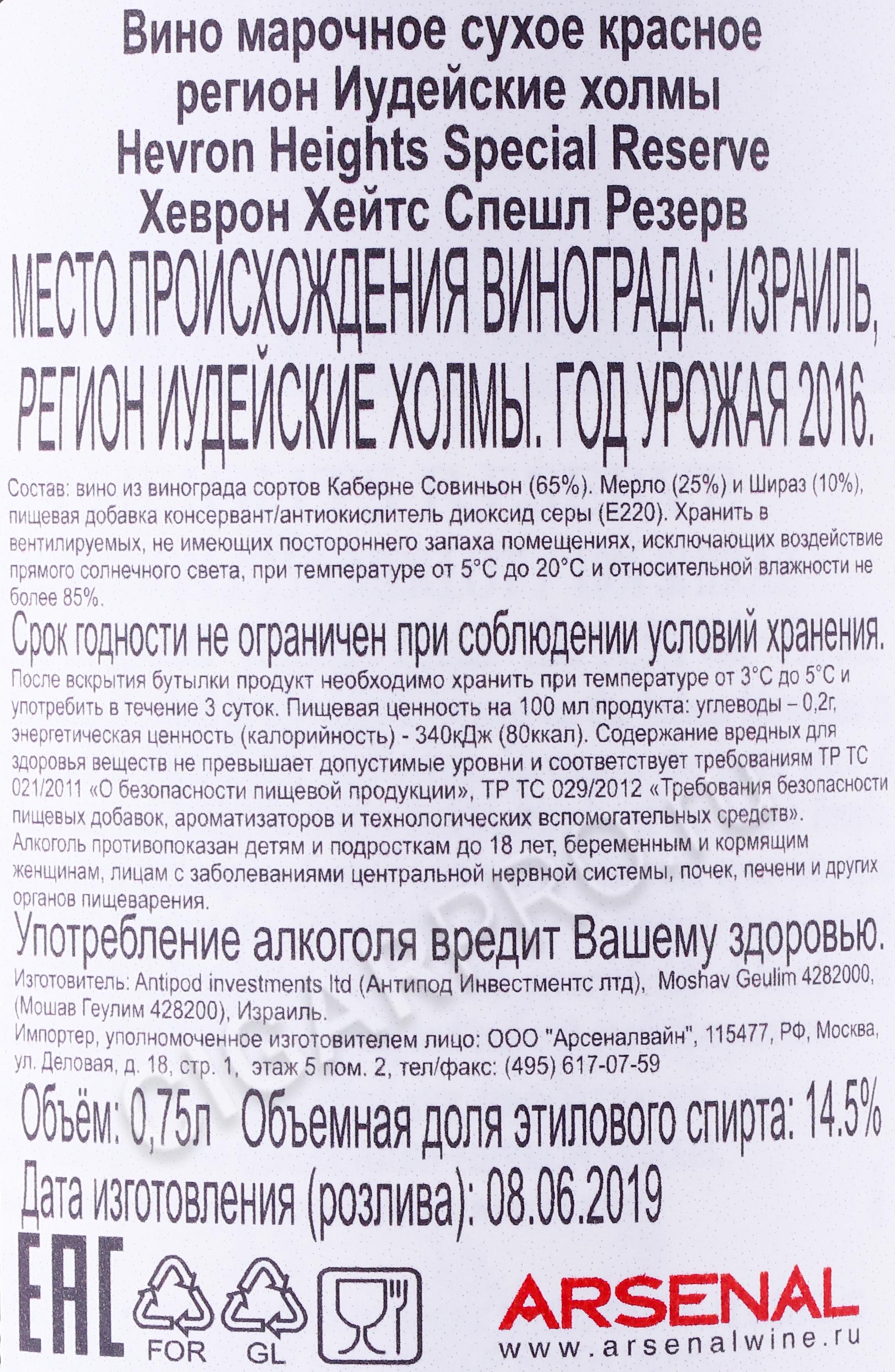 - Hevron Heights Special Reserve 2016 Вино Хеврон Хейтс Спешл Резерв 2016г 0.75л