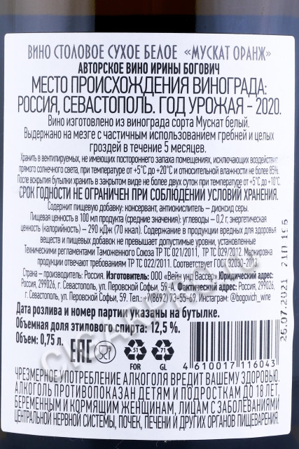 Вино Мускат Оранж Авторское вино Ирины Богович 0.75л