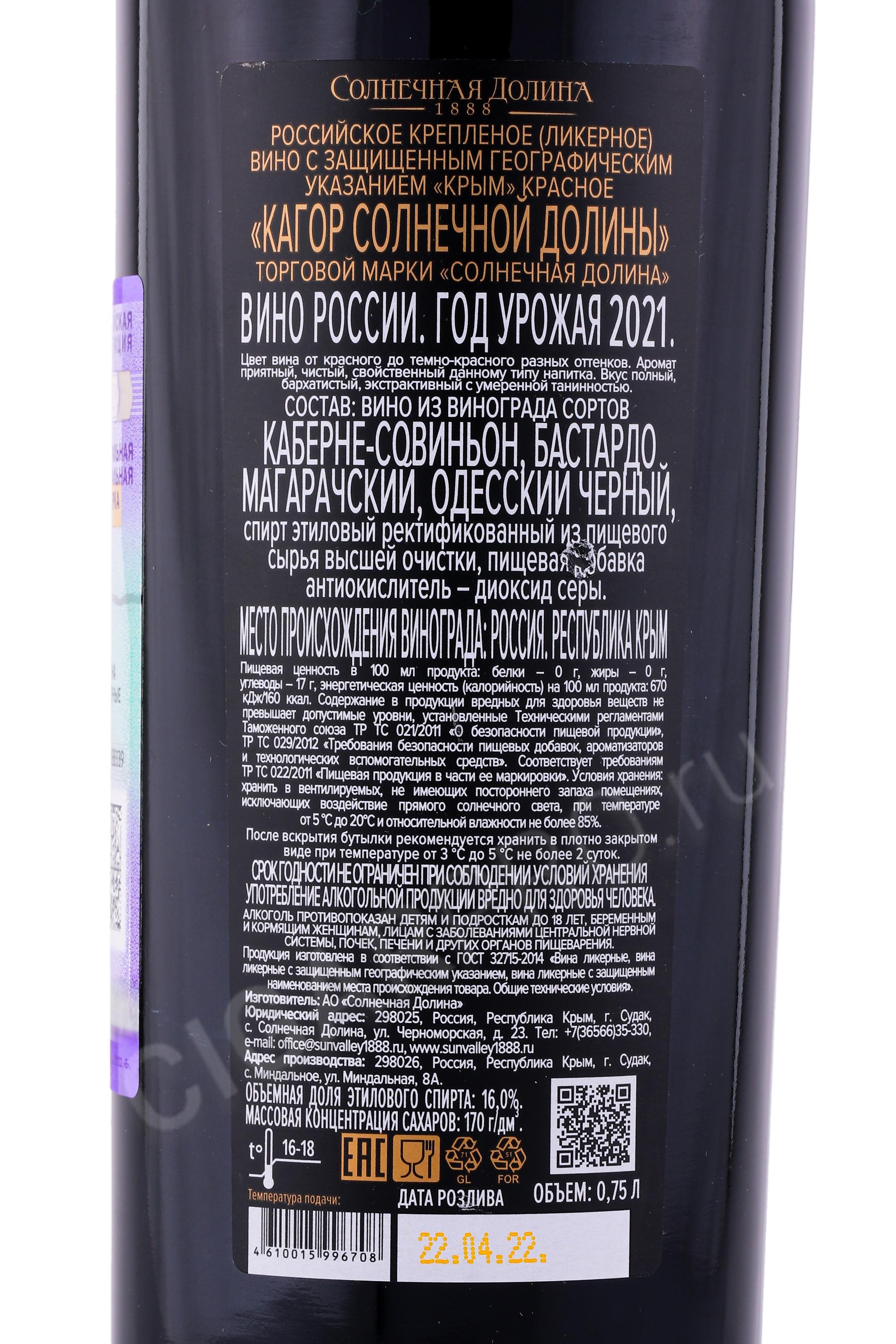 Винный производитель «Солнечная Долина» в данном вине вложил виноградные сорта Каберне Совиньон, Бастардо Магарачский и Одесский Чёрный. Прервав незавершенную ферментацию ректификат спиртом, получил изысканный Кагор в 2021 году.