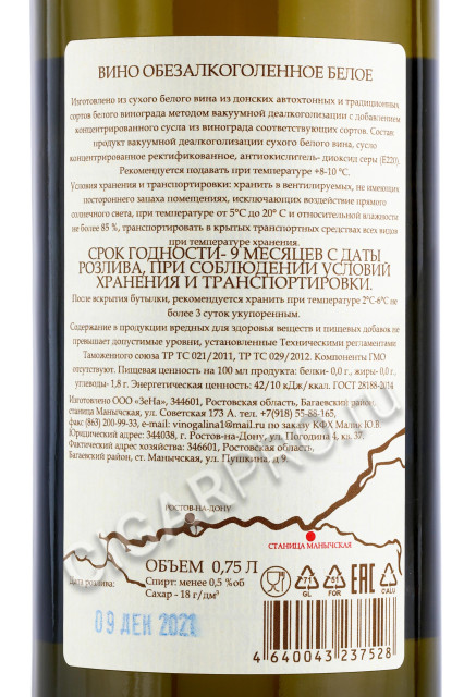 Изготовлено из сухого белого вина из донских автохтонных и традиционных сортов белого винограда методом вакуумной деалкоголизации с добавлением концетрированного сусла из винограда.