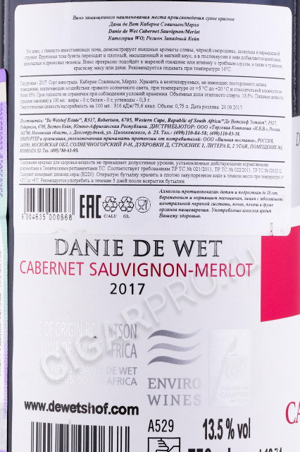 - Danie de Wet Cabernet Sauvignon Merlot Вино Дани де Вет Каберне Совиньон Мерло 0.75