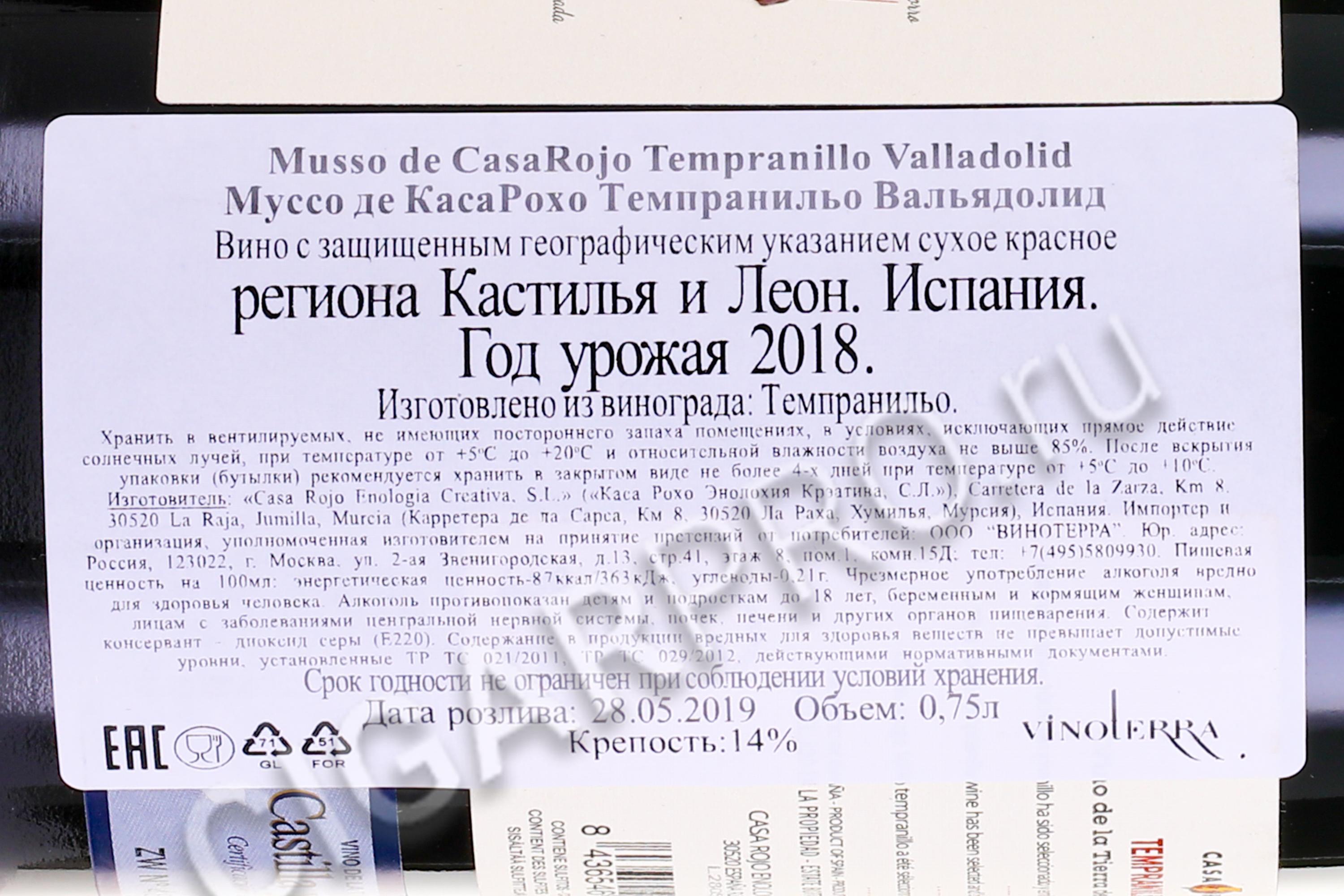 Musso de CasaRojo Tempranillo Valladolid Вино Муссо де КасаРохо Темпранильо Вальядолид 0.75л