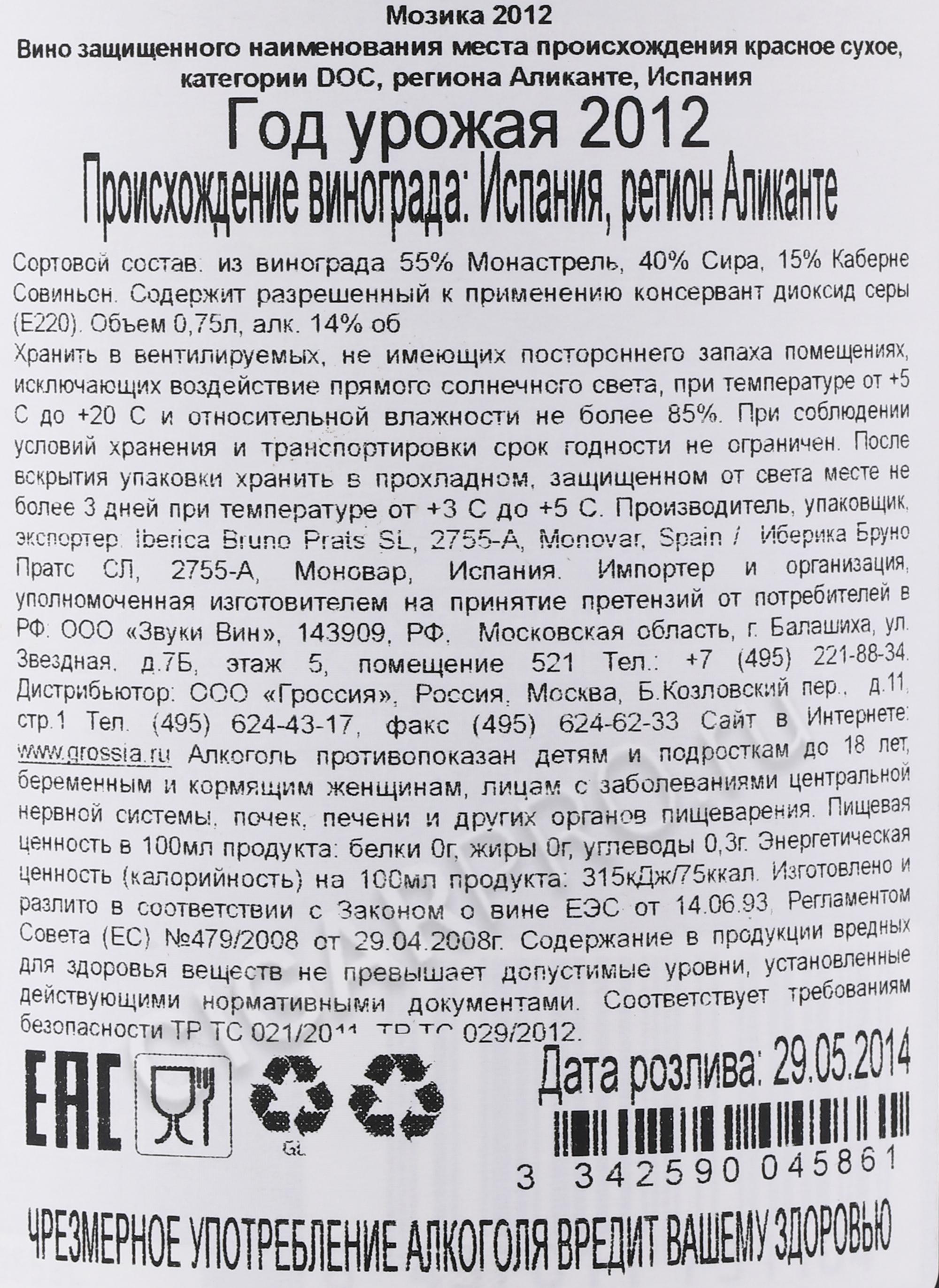Вино Mosyca Monastrell 2012 г 0,75 л – красный сухой сорт из испанских сортов винограда, родиной которых является город Аликанте в провинции Валенсия. Базой для роскошного винтажа служат ягоды Монастрель, остальную часть купажа составляют Сира, Каберне Совиньон и Пти Вердо. На глинисто-известковых каменистых почвах восточного побережья Испании в жарком южном климате ягоды быстро достигают максимальной спелости. Они собираются вручную, сортируются и отправляются на винодельню, где подвергаются классическому процессу винификации. После выдержки в дубовых барриках в течение 14 месяцев вино разливается по бутылкам.