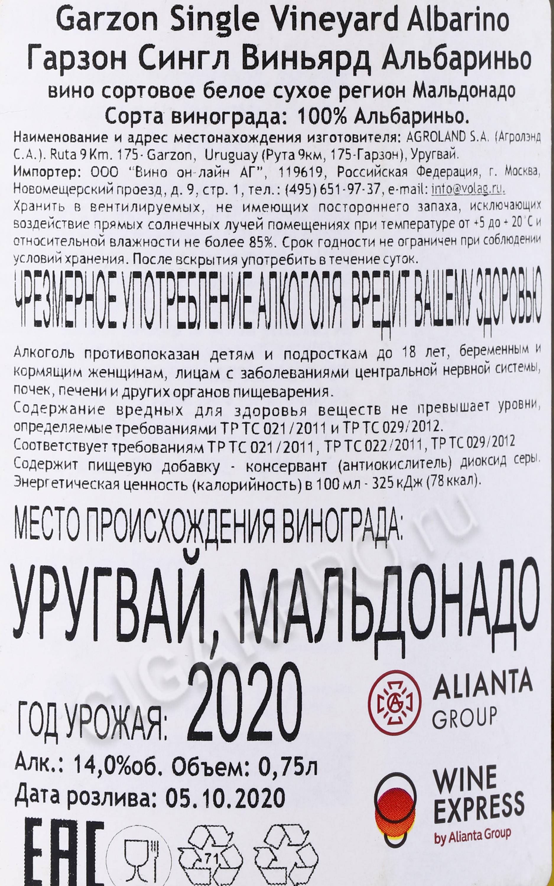 Garzon Single Vineyard Albarino Вино Гарзон Сингл Виньярд Альбариньо 0.75л