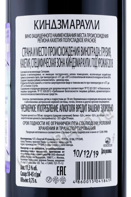 Вино защищённого наименования места происхождения. Это природно-полусладкое вино, прекрасно передаёт неповторимые сортовые ароматы автохтонного сорта Саперави, веками приспособленного к исключительному терруару микрозоны Киндзмараули, Кварельского района Кахетии, Грузия. Цвет густой, тёмно-гранатовый, обладает гармоничным, бархатным вкусом. Отличный диджестив и сопровождение к мягким сырам, чизкейкам с ягодами и фруктам. Подавать охлаждённым от 10 до 12оС.