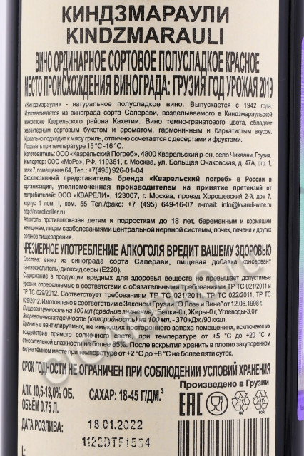 Данная водка произведена из тщательно отобранного винограда Саперави, выращенного на уникальной по составу и богатой вулканическими породами почве микрозоны Киндзмараули Кахетинского района Грузии. Цвет тёмно-красный. Вкус вина бархатистый, с освежающей кислинкой и ярко выраженным сортовым ароматом, с гармонично вплетаемыми в послевкусие оттенками вишни, ежевики и спелой сливы. Лучше всего сочетается с мясом, приготовленным на гриле с кисло-сладким или острым соусом, а также орехами, фруктами и кофе. Рекомендуется подавать при температуре 16-18оС.